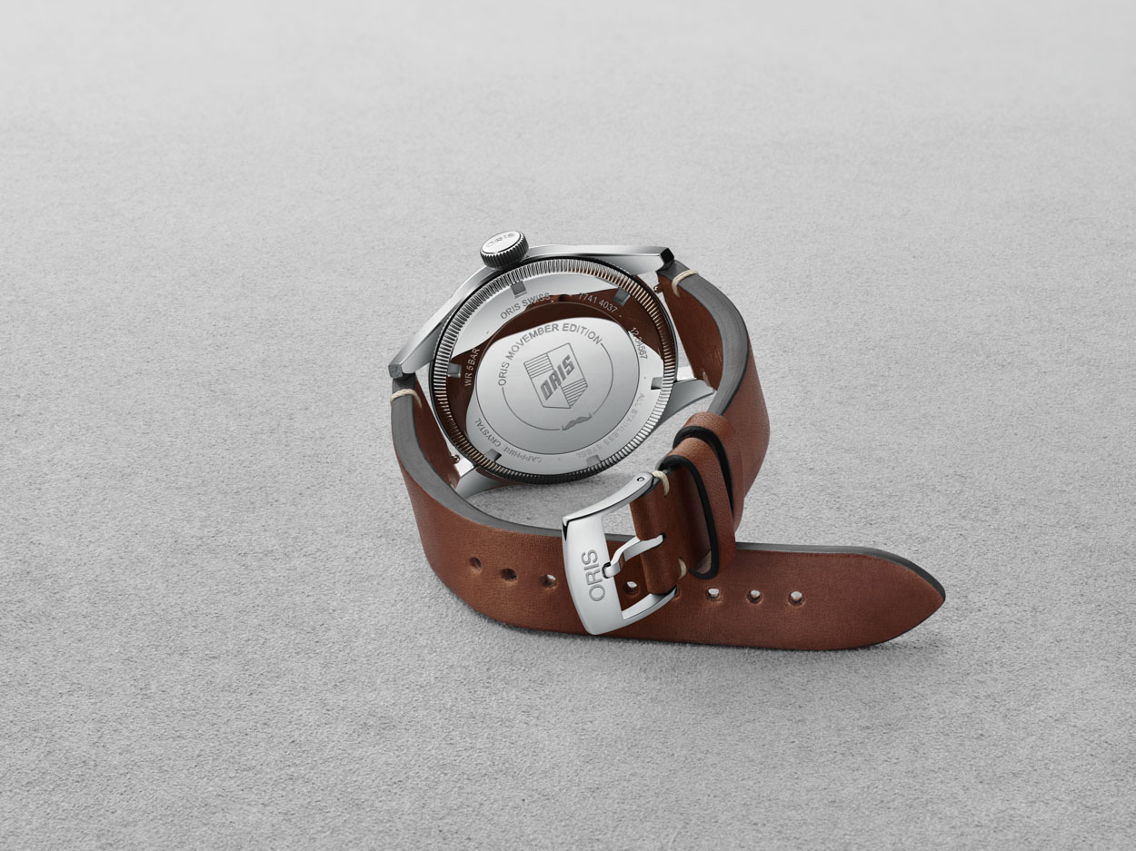 The case back of the watch has a special engraving above the Oris shield, indicating it is the Movember Edition. Inside the case, we’ll find the caliber 754 movement (Sellita SW200 based) that has 38 hours of power reserve. A water resistance of 50 meters is guaranteed, and the crown is of the screw-in type to prevent water (or moisture) from entering the case.