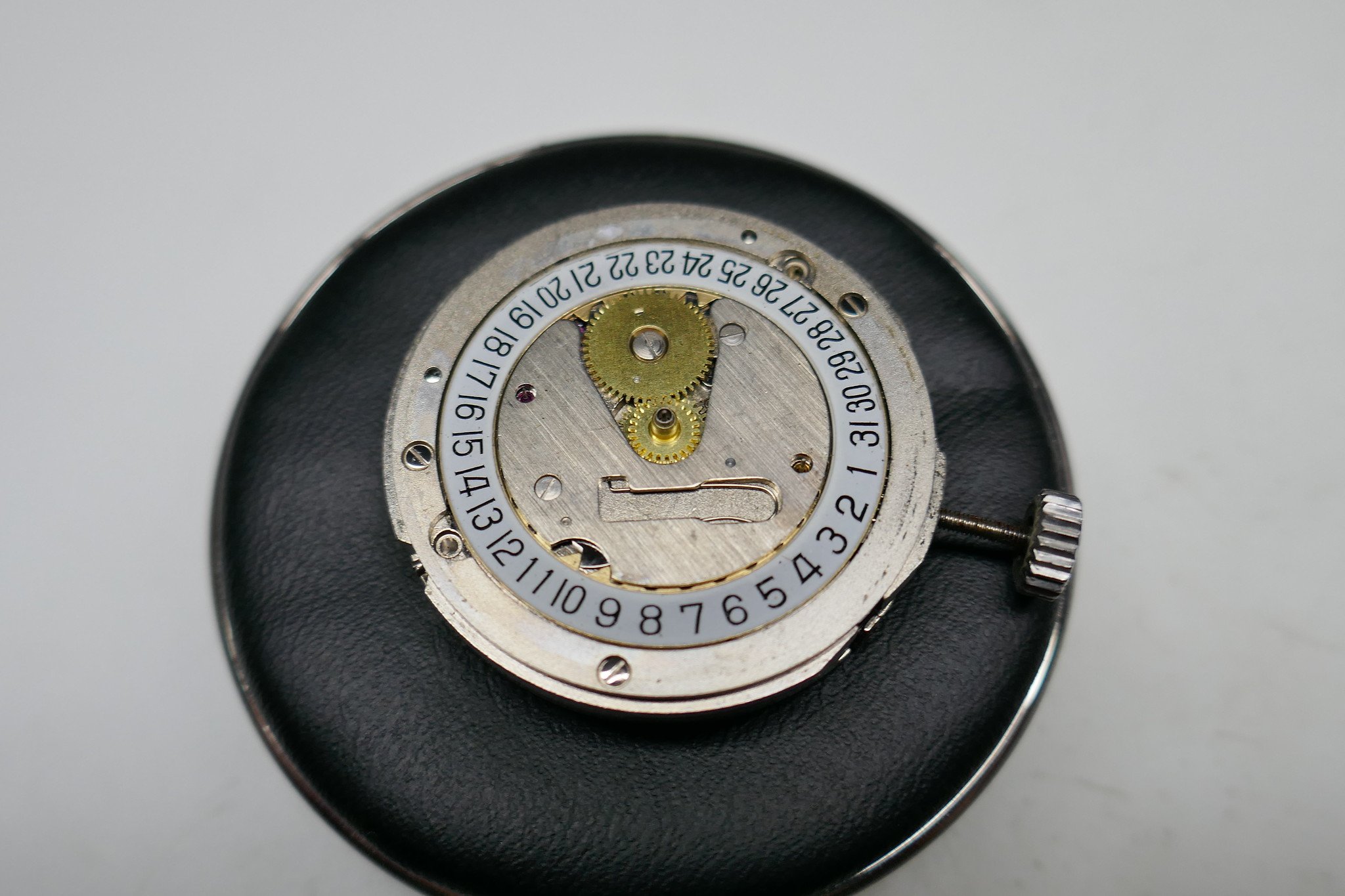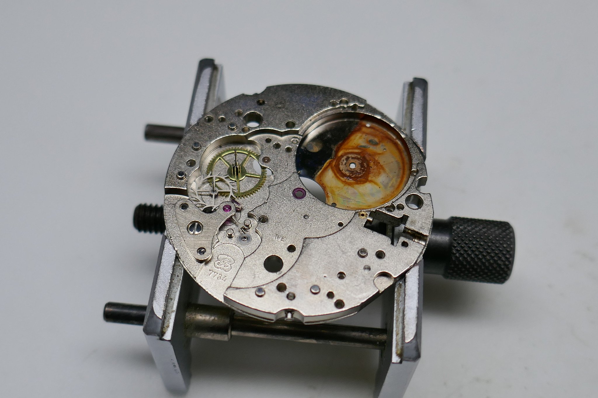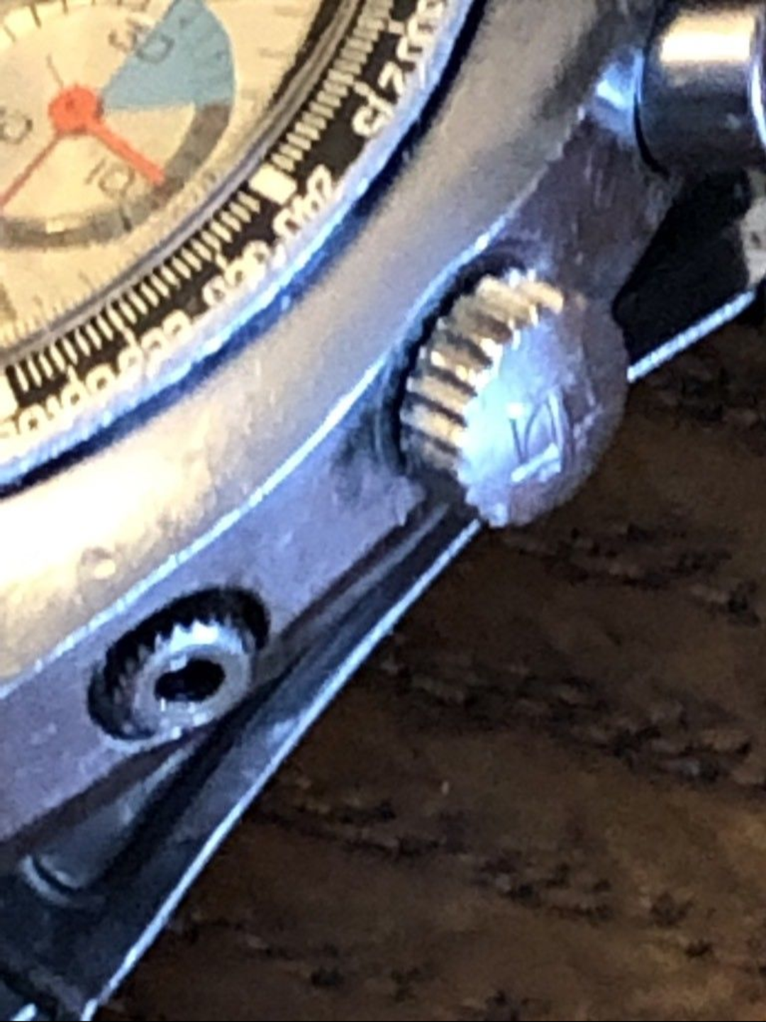 By the way, when I said “missing a tooth”, I wasn’t kidding, the watch was actually missing its bottom pusher. This came as no surprise, however, as the original pictures of the listing had revealed just as much. They also revealed the incredibly clean condition of the colorful hands. In this particular model, they tend to fade and lose their color if they haven’t been replaced altogether by an overzealous watchmaker without access to the correct parts. The cherry on top was the fact that the watch still had the original signed crown, as well as the OEM bracelet, with links to spare.