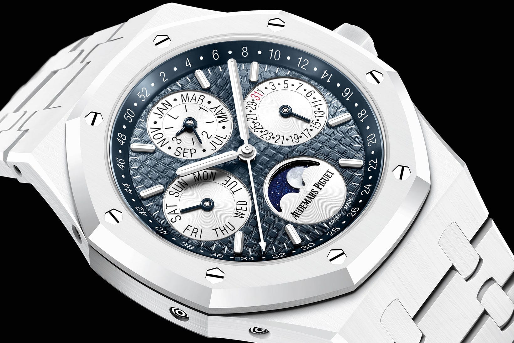 Another knight in shining white armour from AP is a new release that is dead timely, so I must mention it. The Royal Oak Perpetual Calendar White Ceramic (ref. 26579CB.OO.1225CB.01) is a new brother to the highly touted 41mm all-black ceramic version unveiled in 2017. This watch features the same specs, with an in-house movement calibre 5134 that carries a perpetual calendar and moon phase complication. The case and bracelet are made of the same lightweight, scratch- and thermal-resistant material that AP has been perfecting through the decade. The white ceramic model is available exclusively via AP’s own boutiques and priced at 94,300 Swiss Francs.
