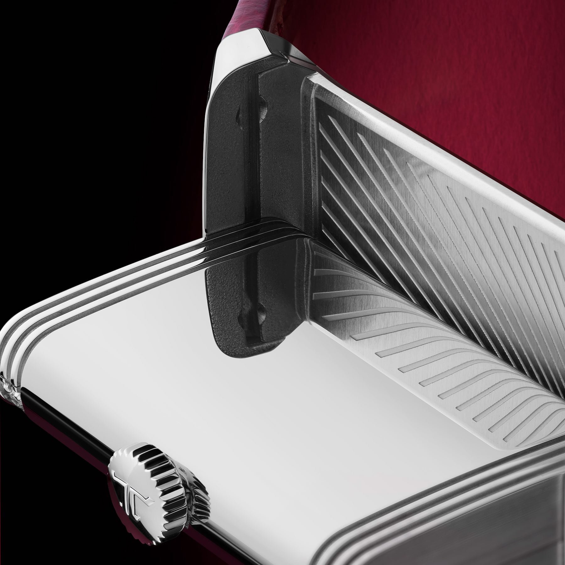 The dial of Reverso One is the most glamorous feature of this timepiece. The deep red sunray guilloché lacquered dial emphasizes the pattern placed on the inner part of the case. However, this model comes with an undecorated engraving. That leaves space for a bit of personalization should its owner so desire. The shiny alligator strap is a final, exotic flourish, to a very vibrant timepiece.