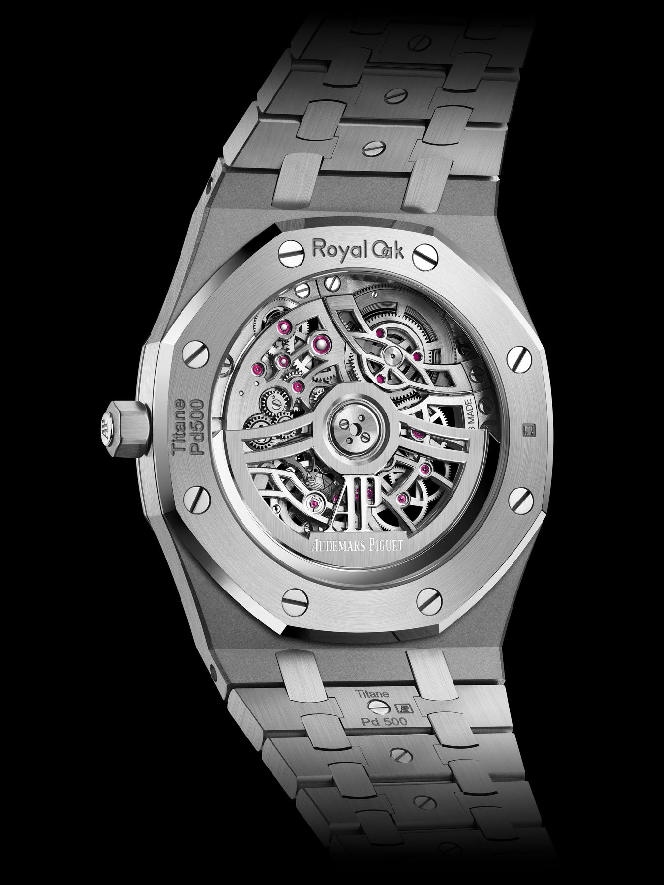 For fans of the traditional RO size, there’s the 39mm Royal Oak “Jumbo” Extra-Thin Openworked powered by AP’s rhodium-plated caliber 7124. This 8.1mm-thin watch is made of titanium, but its octagonal bezel and the bracelet’s studs are made of BMG (Bulk Metallic Glass). For those unfamiliar with this, it’s a metal alloy with high strength and corrosion resistance. This scratch-resistant material is perfect for use on the bezel and bracelet parts, as they would otherwise show the most wear. BMG is not unique to AP; other brands (Panerai, for example) have also been using this metal alloy.