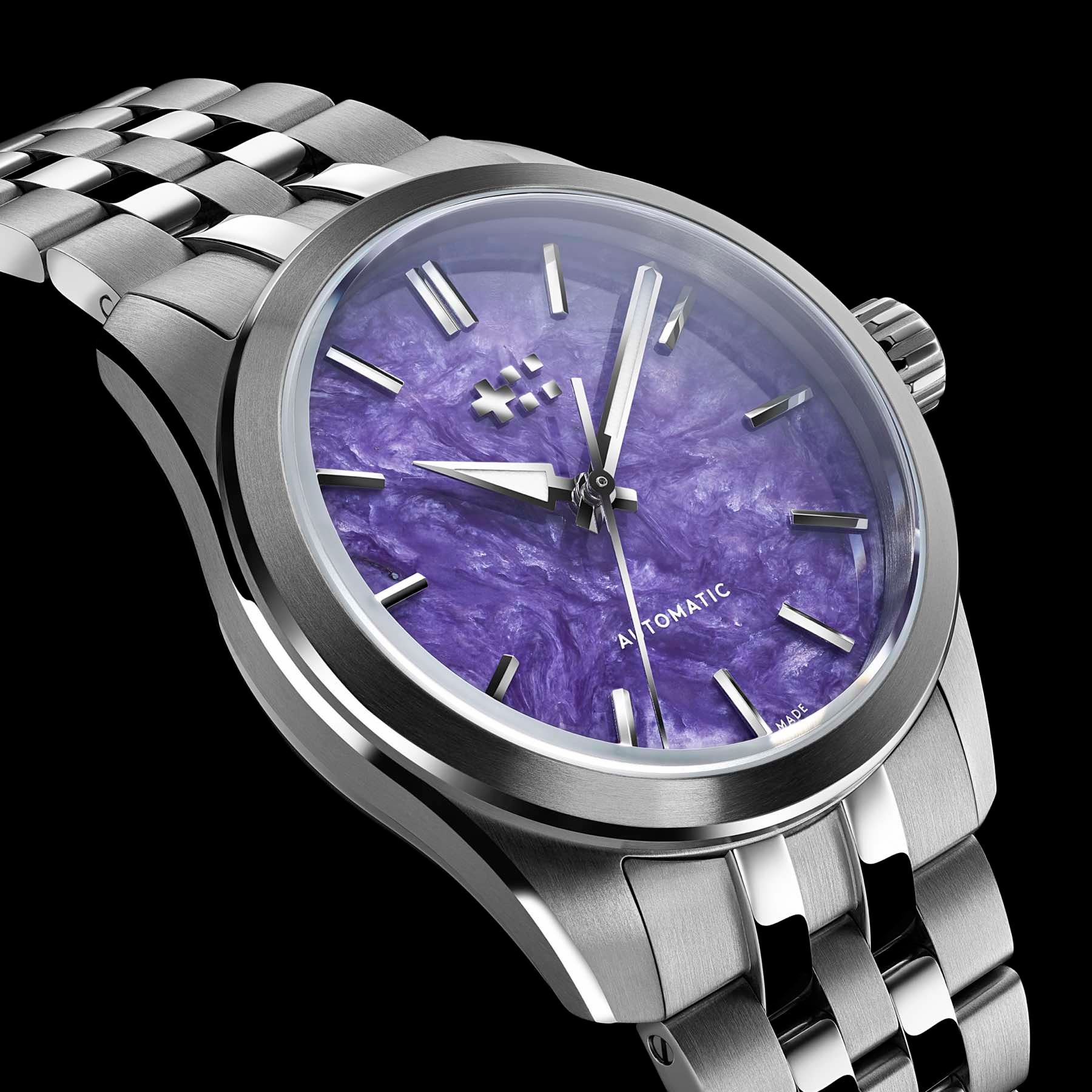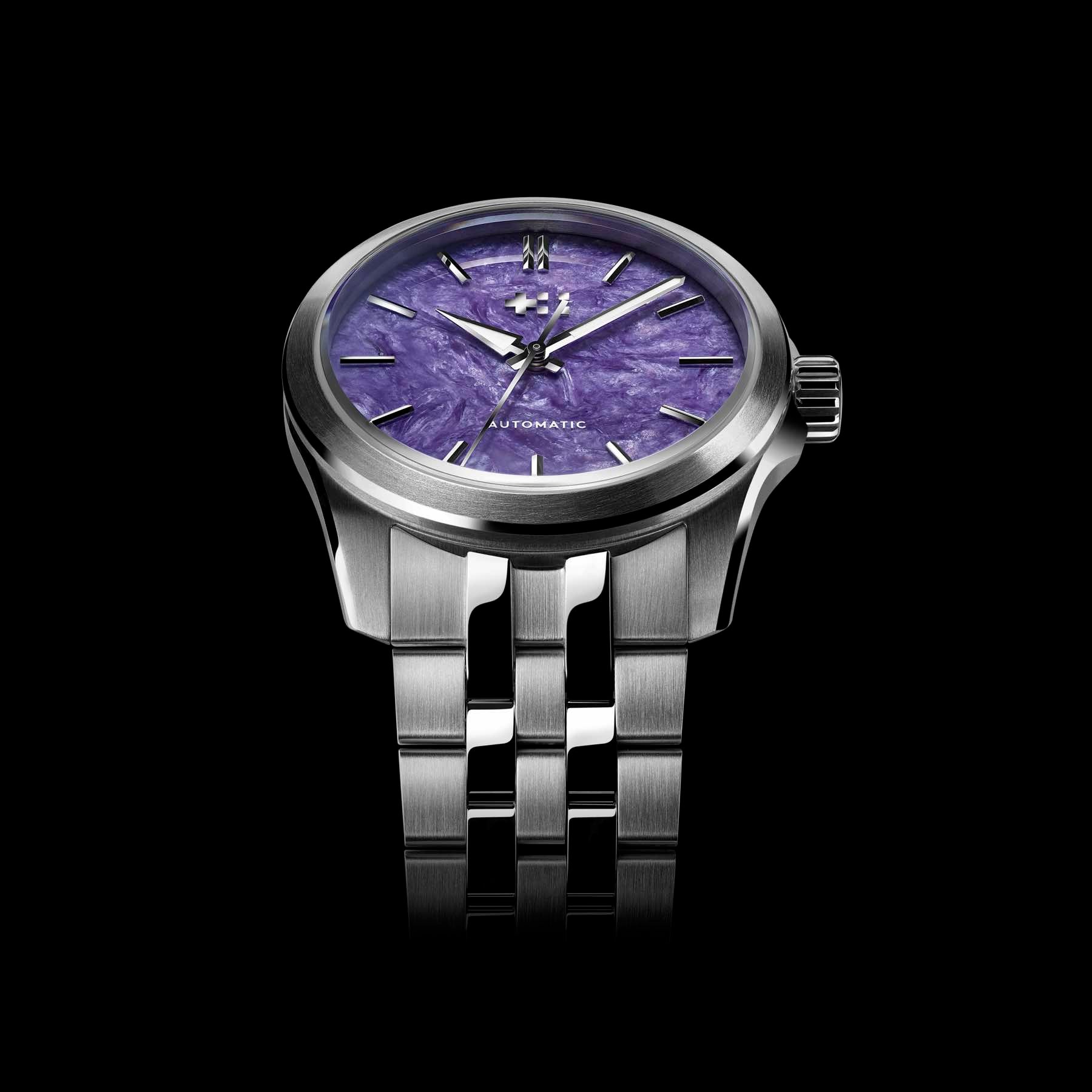 The highlight of the Christopher Ward C63 Sealander Stones is, of course, the dials. Malachite shows green banding, charoite offers purple swirls, turquoise displays vivid blue-green tones, and tiger’s eye reveals golden stripes with a shimmering effect. Each dial is naturally unique, as is always the case with stone dials. Finishing touches include diamond-polished indexes, an applied twin-flag logo, and hands with Super-LumiNova X1 BL C1.
