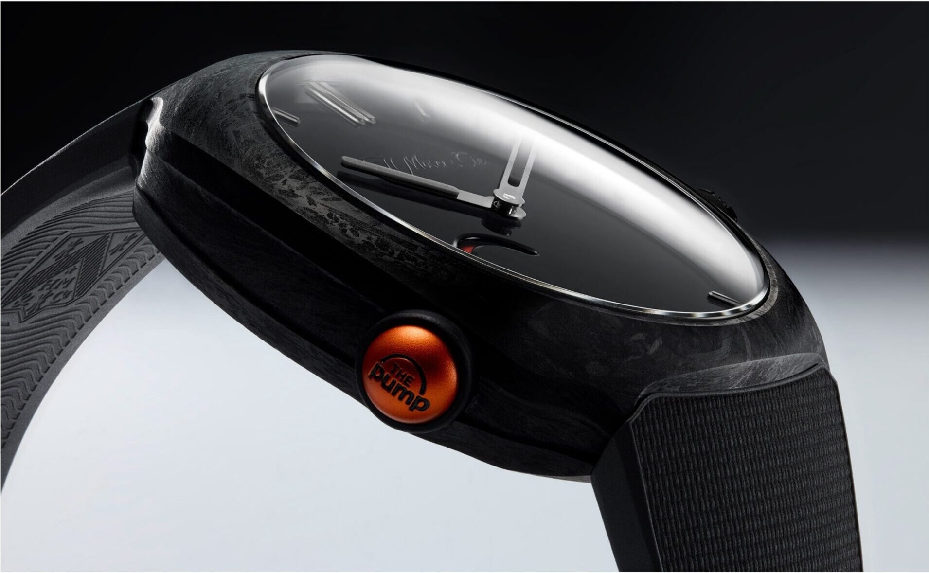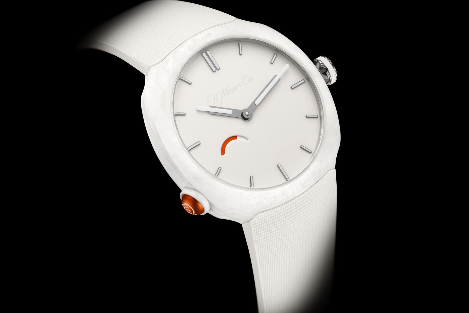With the reference 6103-2200, we get a case made of black forged quartz, while the reference 6103-2201 offers the same design and material but in white. The use of quartz for the cases is unusual, but it’s “very Moser” to produce something like this. It’s more “normal” than a case made of Swiss cheese; that’s for sure. The Reebok-inspired orange button on the side of the case, which says “The Pump,” lets the wearer manually wind the movement just by pressing it. This is a very fun detail.