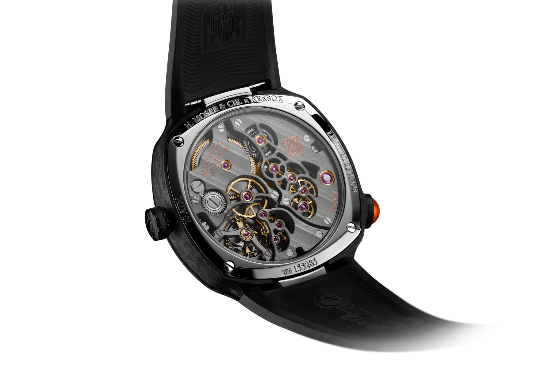 Inside beats the HMC 103 manufacture caliber. This 30 × 4.5mm movement is a re-engineered example of the brand’s HMC 500, eschewing the micro-rotor in favor of manual winding. It runs at 21,600 vibrations per hour, contains 131 components and 31 jewels, and has a power reserve of 74 hours. Displaying an anthracite finish, Moser stripes, partially skeletonized bridges, and gold-tone and ruby accents, it’s also quite a handsome caliber.