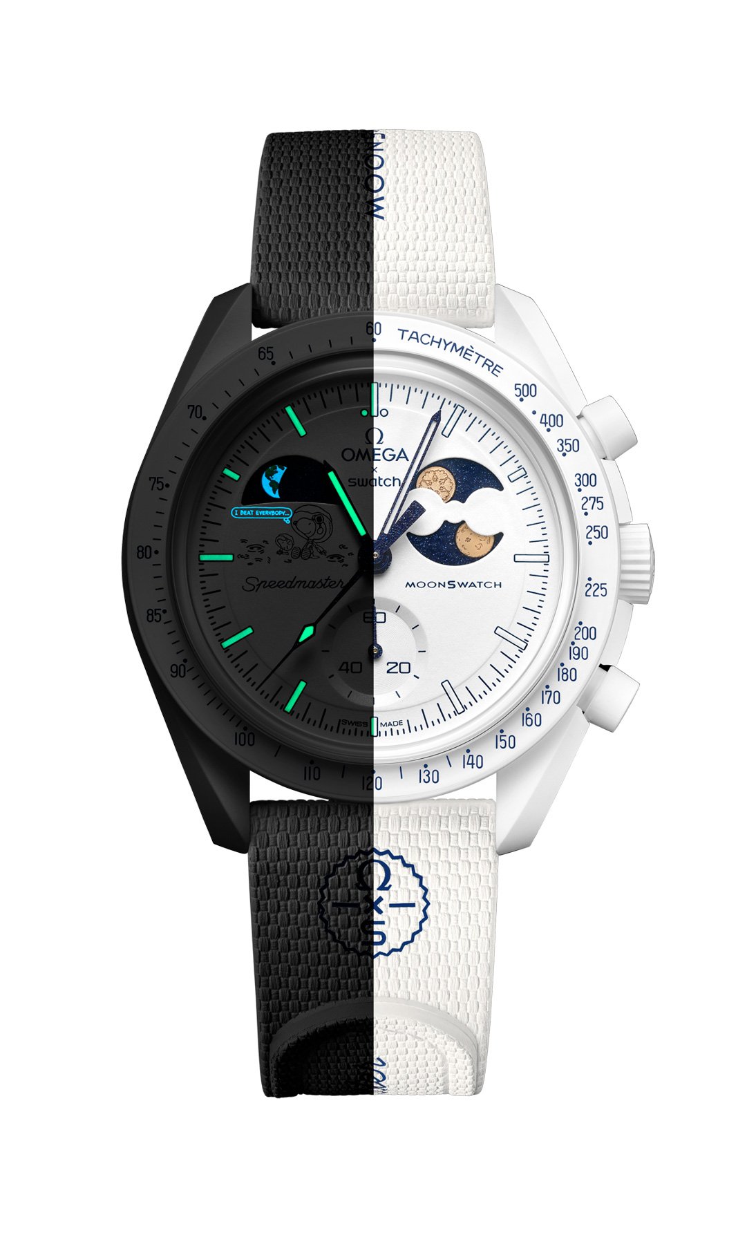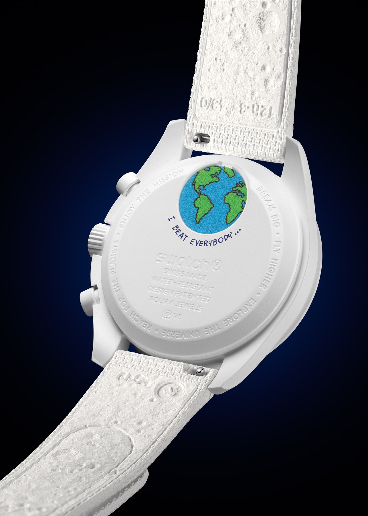 The hour markers and hands have an application of green-glowing Super-LumiNova. A UV light will reveal a “secret” sentence next to the image of Snoopy and Woodstock that says, “I beat everybody…” On the case back, under the battery cover, we find that sentence once more in blue. This MoonSwatch Mission to Earthphase Moonshine Gold also comes complete with a white rubber strap with a white Bioceramic loop.