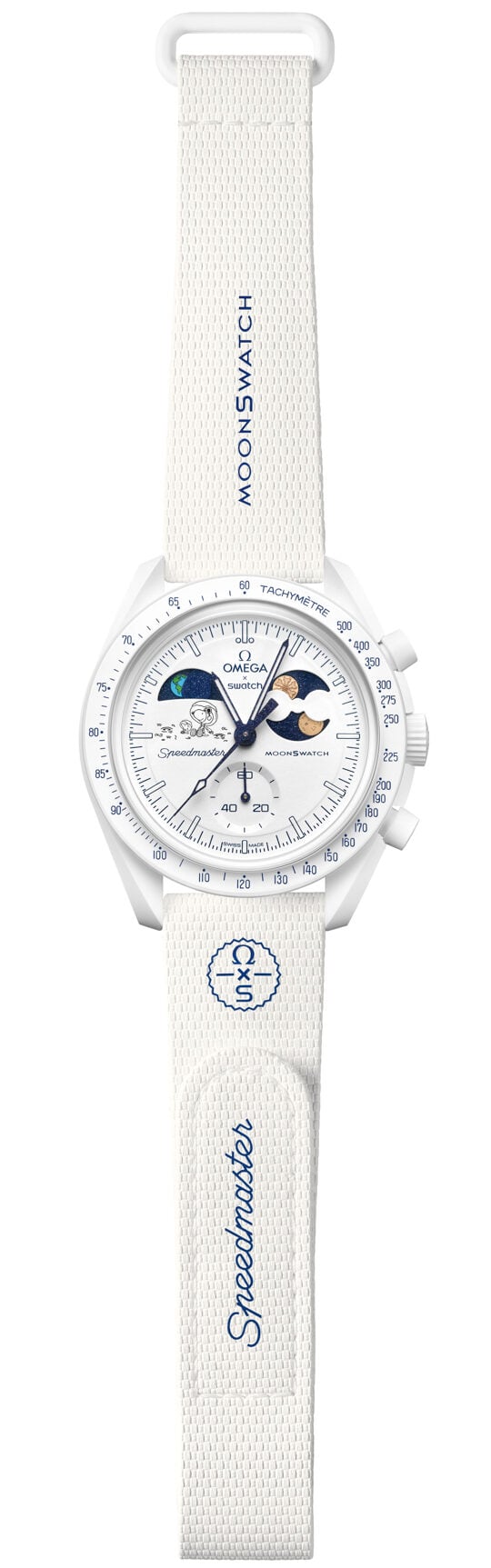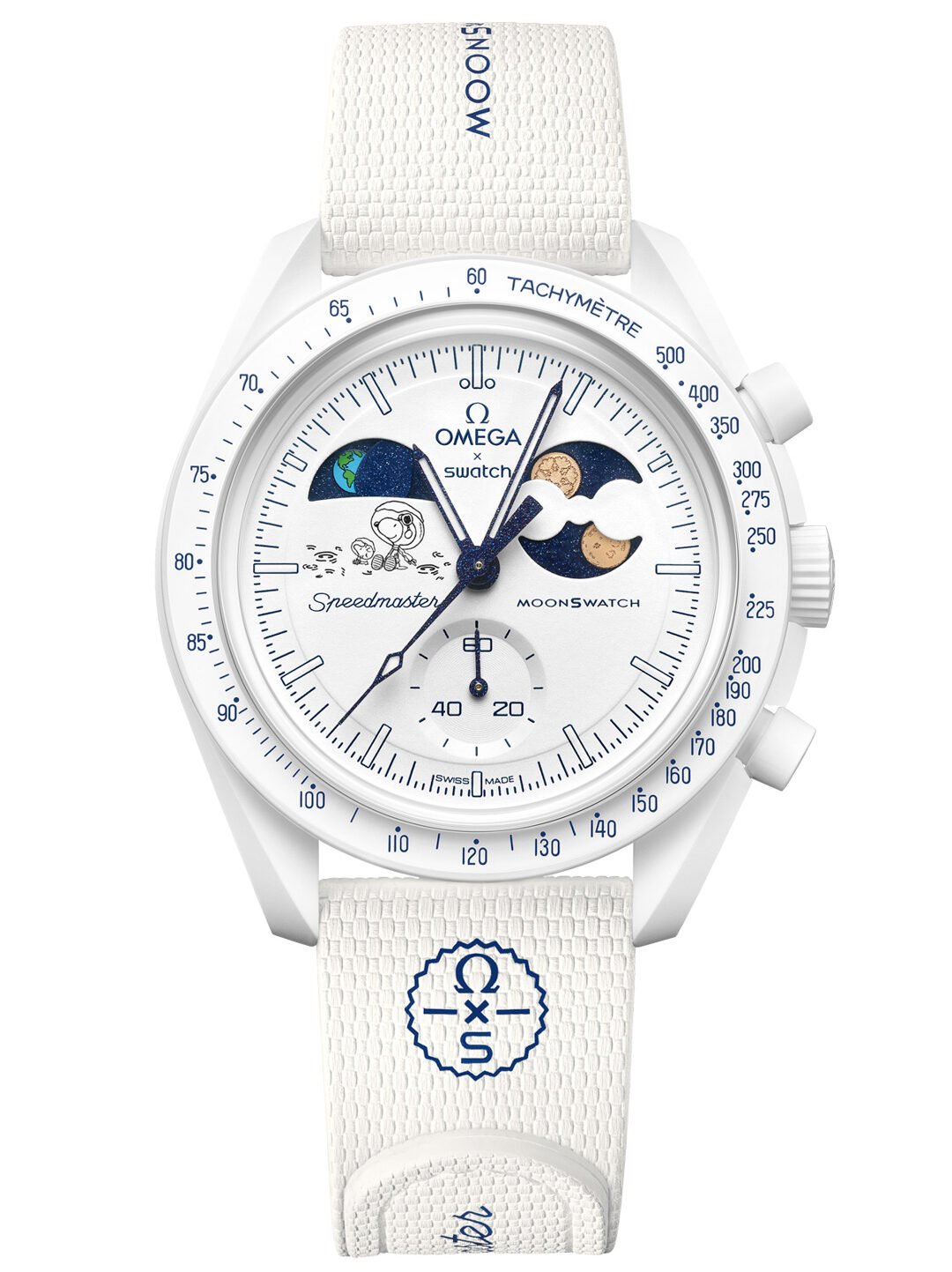 At 10 o’clock, you’ll find the earthphase indicator, Swatch’s twist on celestial timekeeping. Instead of showing how the Moon appears from Earth, it shows how Earth appears from the Moon. When we see a full Moon, someone standing on the Moon would see a “new Earth,” and vice versa.