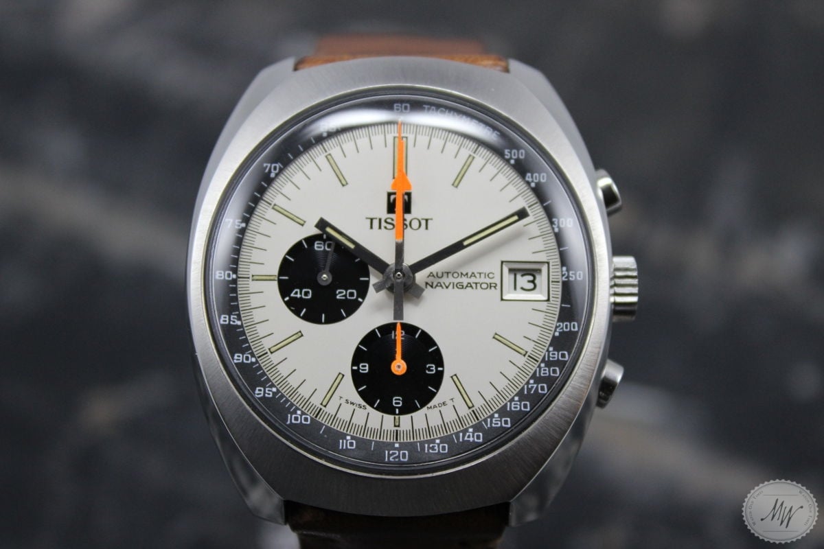 With a diameter of 43mm and a height of 14,8mm, the watch isn’t too big (or too small) and comparable to many other chronographs on the market. The case shows a bit of resemblance with the Speedmaster Mark II for example, which isn’t strange as that watch was originally from the same era. If we take a look at the watch that inspired this Tissot Heritage 1973, the Navigator, it certainly shows similarities. The original Tissot Navigator was a bit smaller, at approx. 39mm, but the case shape is very similar to the new Heritage 1973 chronograph.