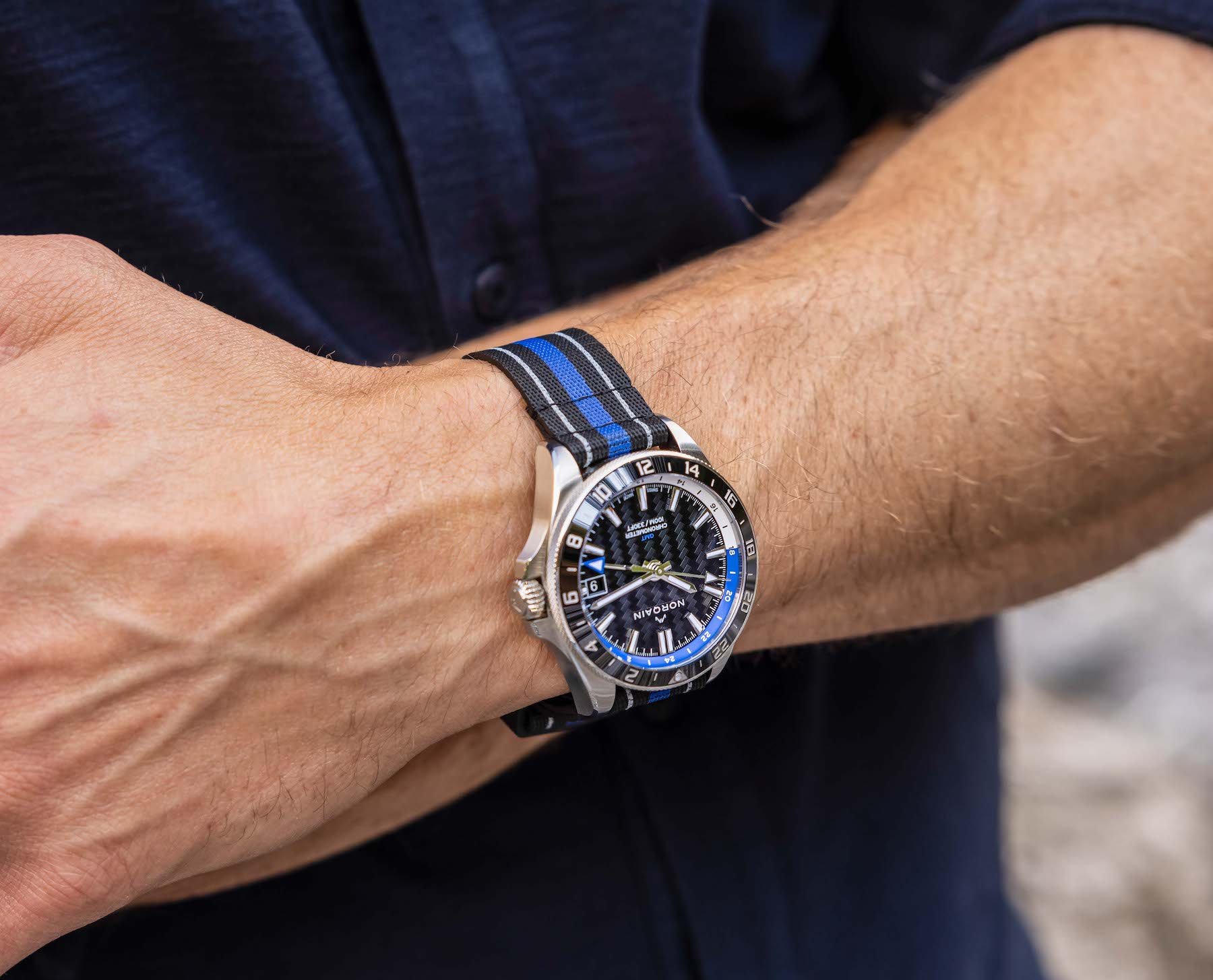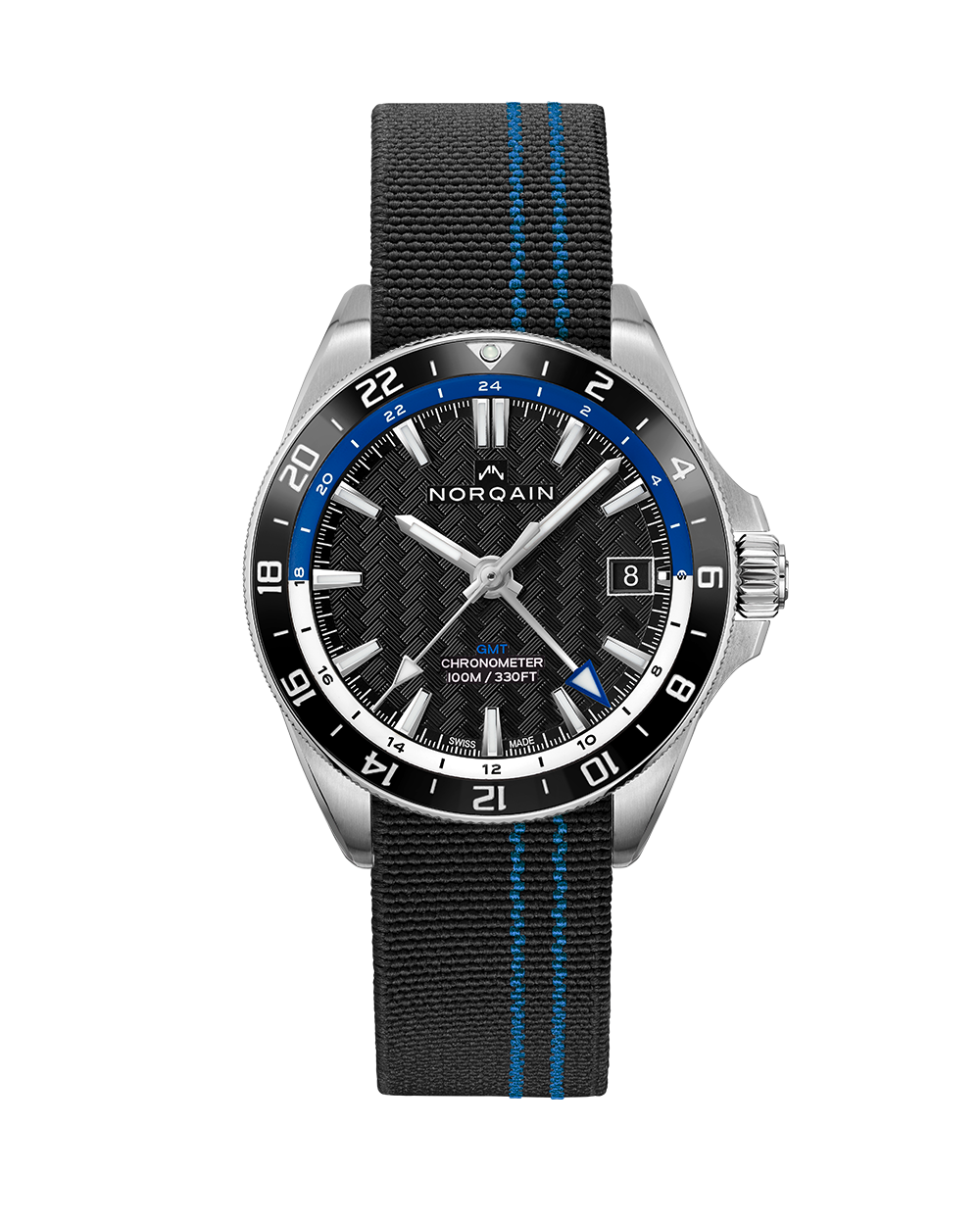 Norqain has really taken the use of color in its watches to heart. All three watches feature black dials with the brand’s signature texture and matching black ceramic 24-hour bezel inserts. There are no Pepsi or Coke bezels here! The color is incorporated in accents on the watches themselves, further enforced by the matching Nato straps. Still present on the dial and GMT hand, on the steel option the color is nicely toned down. The rehaut also has a 24-hour scale, half in the color of the watch, and the other half in white, serving as a day/night indicator.