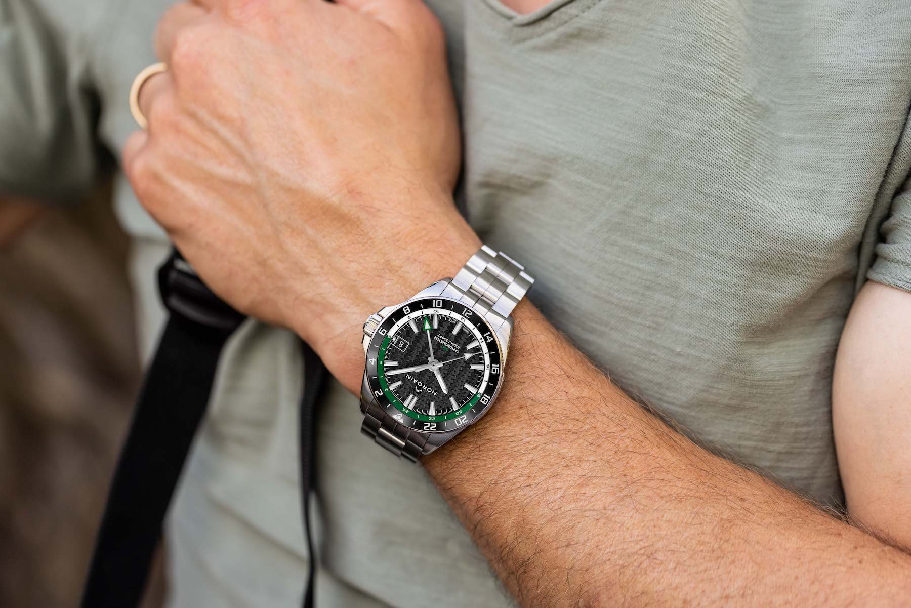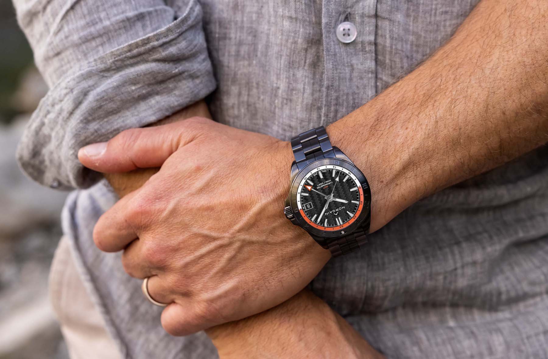 As with the Neverest divers, Norqain has split the trio in two. There’s a pair of standard models, in royal blue and forest green, and then there’s the piece de resistance — the centerpiece of the collection. In the case of the Adventure Neverest GMT line, it’s a satin black DLC-coated model with orange and white details and a textured black dial. The blue and green pieces come in a familiar 41mm stainless steel case with 20mm lugs, which comes in at 14.94mm thick. The dimensions are the same for the black DLC version, but the satin black finish is what sets this one apart. The other Fratello editors can be glad this one was not around for the Summer Splash, as this model would have made a worthy contender, ticking all the boxes to be a potential winner!