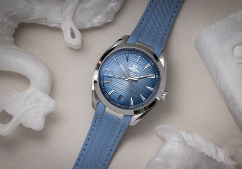 In terms of summery vibes, all three models are perhaps the best. In particular, the 41mm Aqua Terra 150M on a light blue rubber bracelet. This combination is an absolute stunner. A light blue dial with a teak pattern and a light blue rubber strap — it hardly gets more summery than that. While the Worldtimer might look far more technical and complicated, adding a rubber strap to the watch does wonders for it. If you are traveling through multiple time zones to get to your holiday destination, this could be the watch for you.