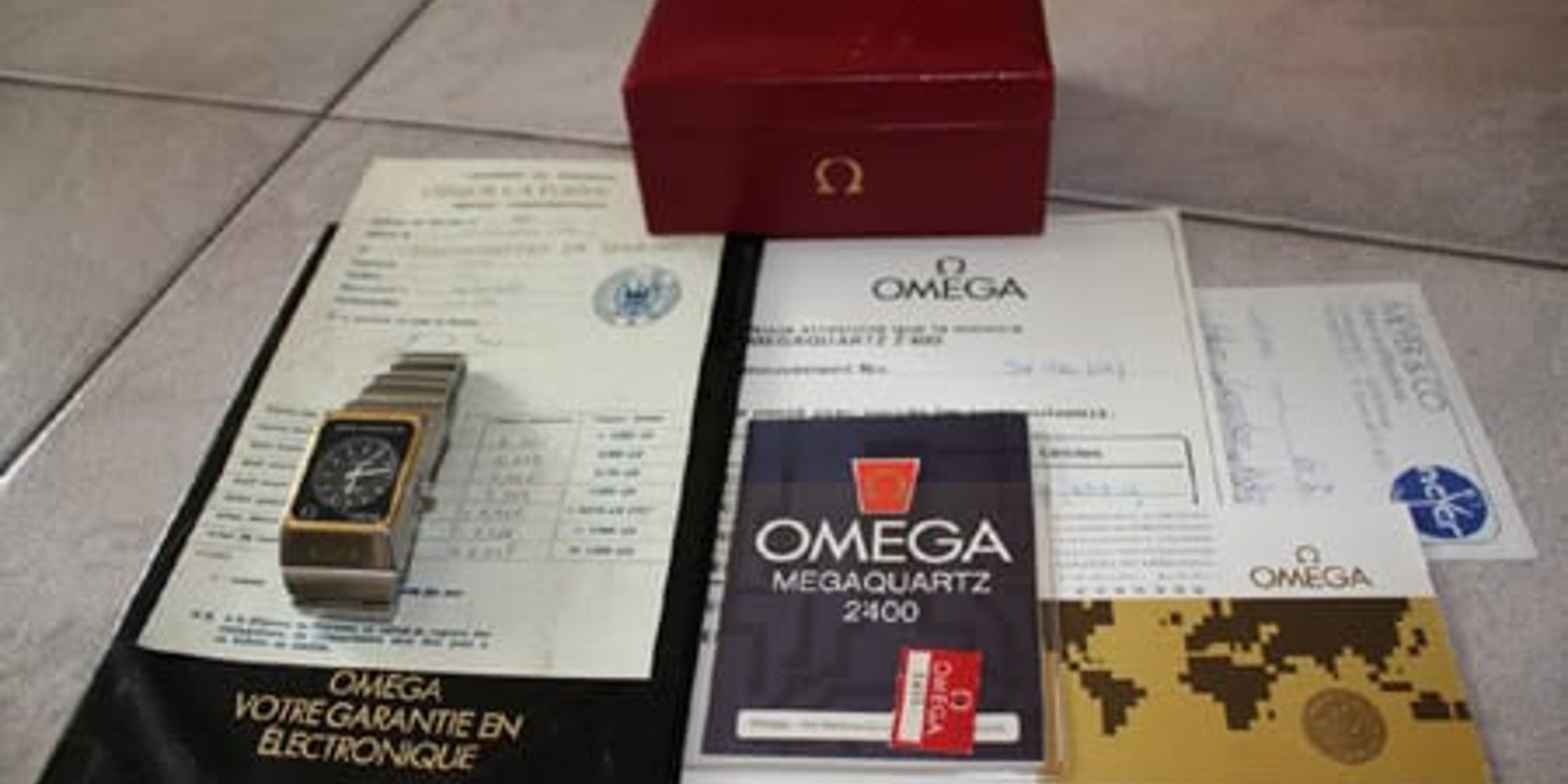 Mauriche, owner of the watch as pictured below, is a lucky bastard to have it complete with original Omega manual (Megaquartz 2400 booklet in German), Omega warrantee card, Marine Chronometer certificate of the Besancon University, Marine Chronometer test report by Omega, original box, price tag (3450 Swiss francs), receipt and all spare links for its bracelet. Wow!