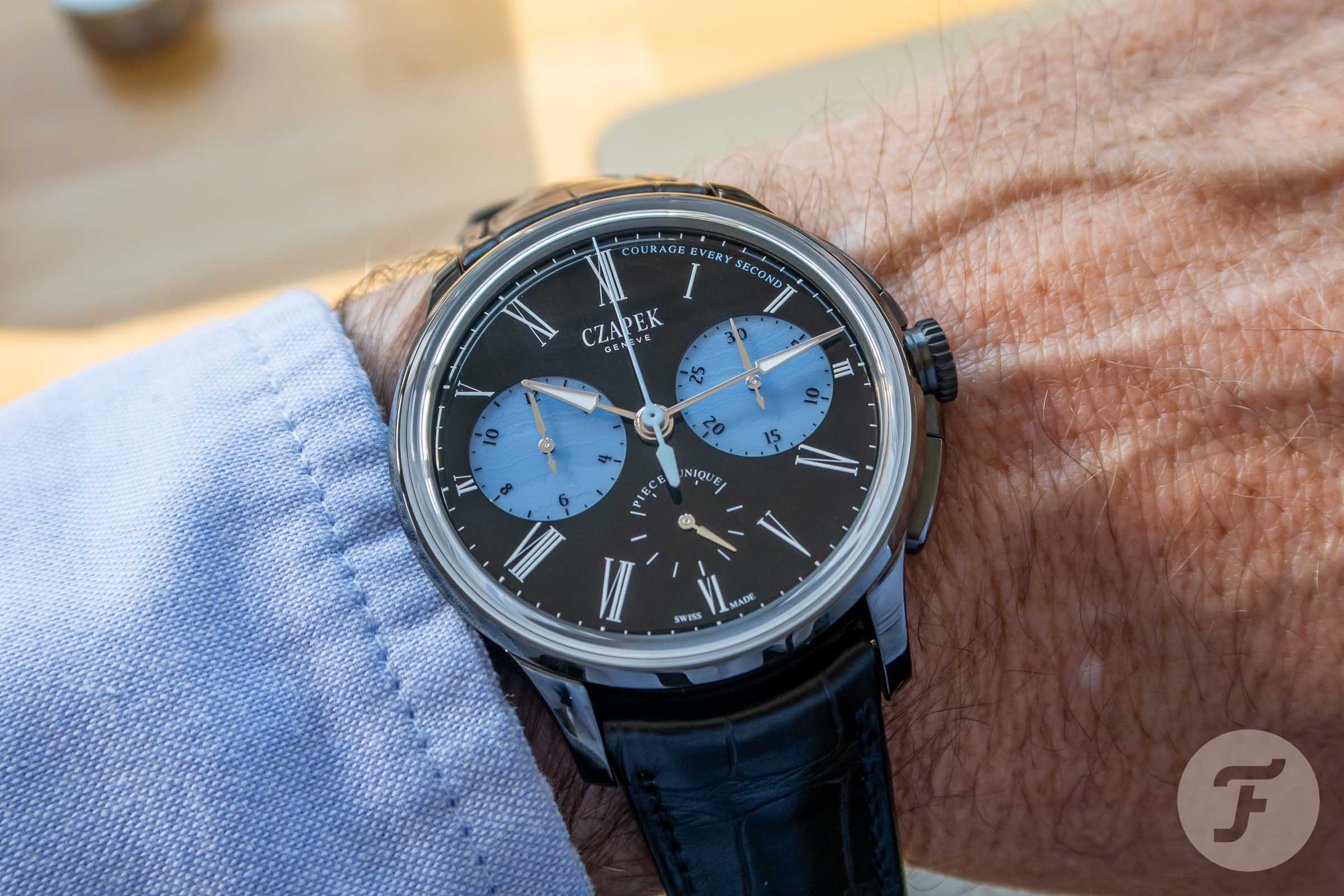 During my visit mentioned above, I had the opportunity to have a look at the watch in a pre-definitive stadium already, and even put it on my wrist. It can be seen that the color of the large chronograph second hand of that model still needed some finetuning to be adapted to the color of the chalcedony counters. But all in all, it was a watch with a beautiful presence, without being overly present. You’ll find in-depth information on the watch here.