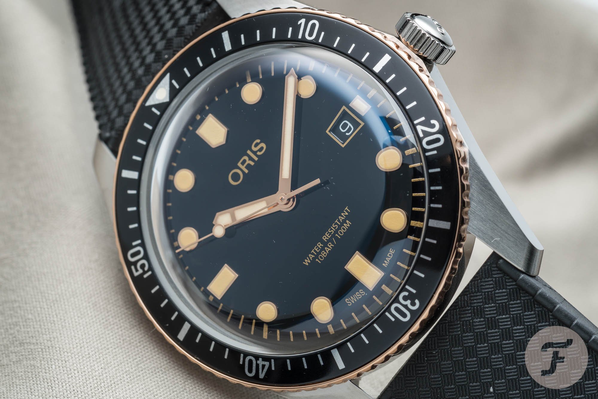 It is very easy to read the time on this watch, big markers and broad hands. I also applaud Oris for not putting a date aperture on this watch. On the dial itself, we only find ‘Oris’ and ‘Water resistant, 10bar / 100m’ on there. Below the 6 o’clock marker, there’s ‘Swiss Made’. Perfect.