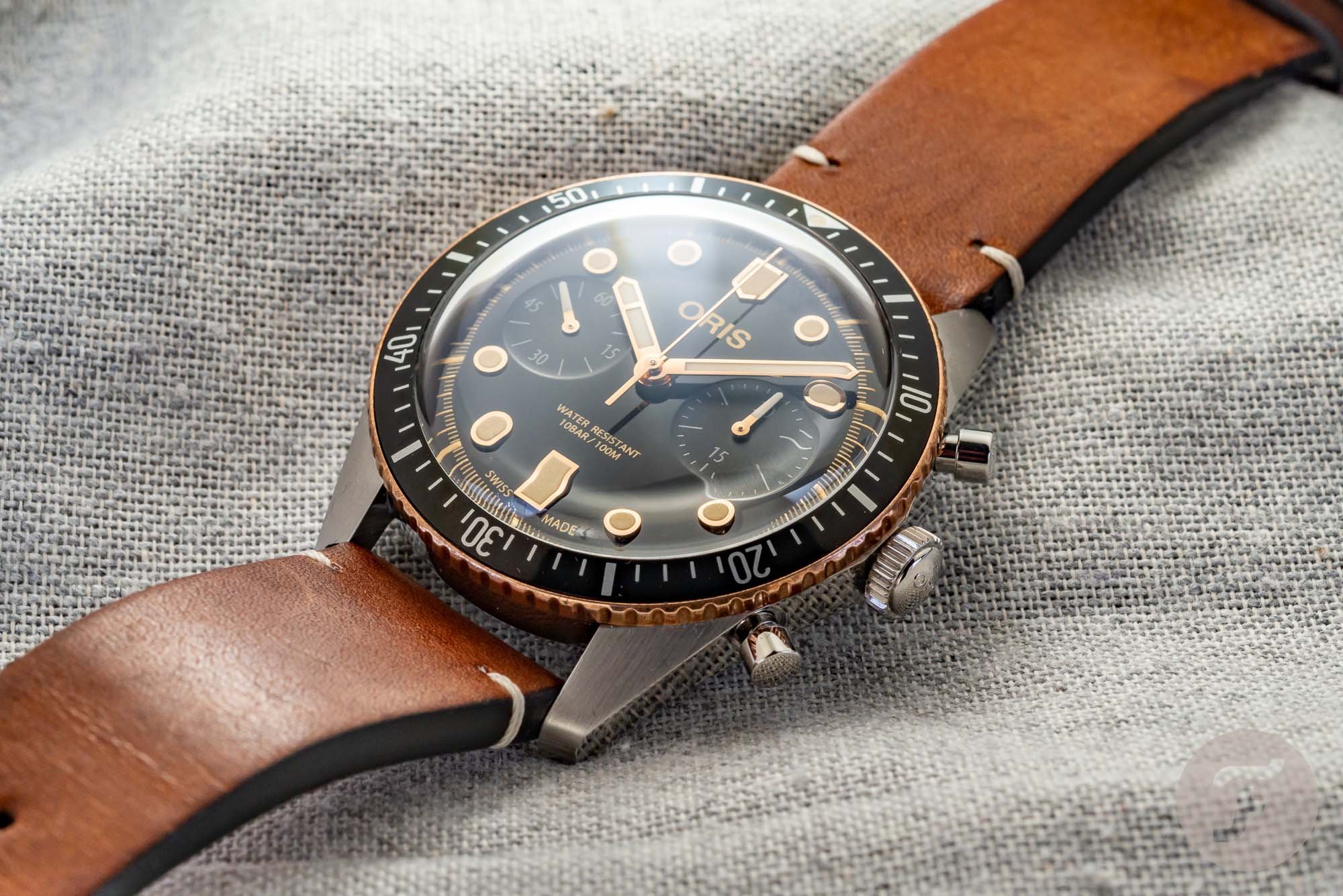 It is no secret that I am a fan of two-tone, I’ve been writing about its comeback for a few years now. At first, I thought it would be just wishful thinking, but more brands seem to be picking up on the return of bi-color watches. It might be just another wave or things that have been done in the past, but I definitely think there’s a place for two-tone watches as long as it is being done right. And in case of the Oris Sixty-Five Chronograph, it definitely is done right. Although I wouldn’t have minded a bit more gold (or in this case: bronze) tones, I do have to admit that this is probably more sensible. Especially for the long term, when the demand for two-tone might be fading away again, you can still rock this Oris Sixty-Five Chronograph. The bronze uni-direction diving bezel and the rose gold PVD hands and indices match perfectly and are still subtle enough for daily wear.