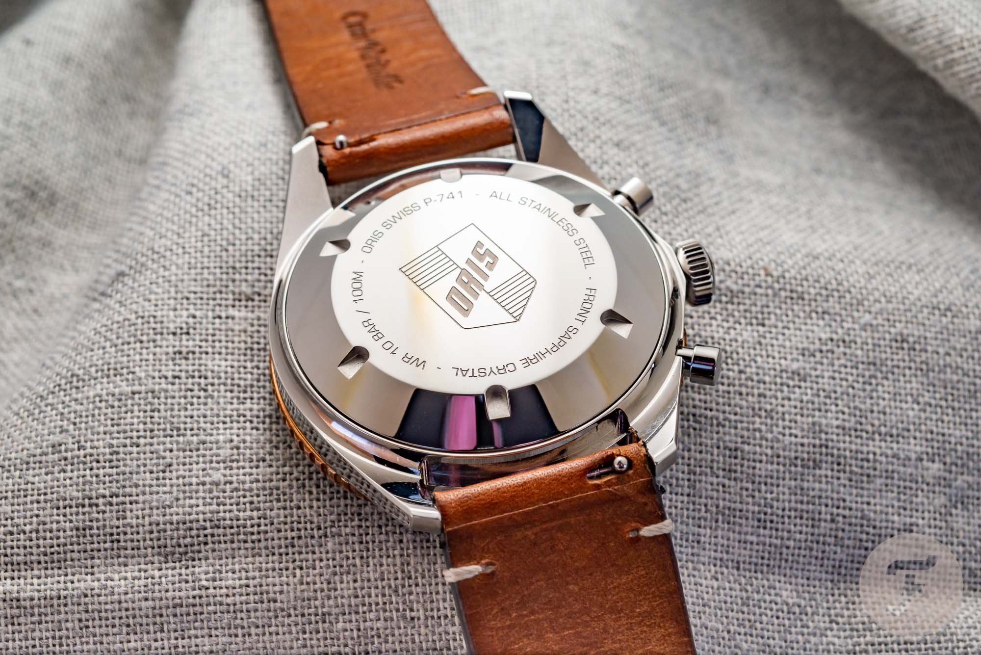 As you can see, the movement isn’t visible as the (screw-in) case back is solid stainless steel. Engraved with all necessary information in the center of the case back, including the famous Oris shield logo. The crown for winding and setting the watch is screw-down, to ensure water resistance (100 meters).