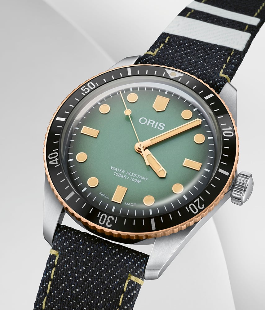 This might just be my favorite dial design of the Divers Sixty-Five so far. The gradient mint-green dial is icy cool. It reminds me of the Oris Aquis 39.5mm with a similar color that comes in a more modern package. But, as the name suggests, the Sixty-Five is deeply rooted in the past. Yet the enthusiasm for the collection has not subsided since the Sixty-Five was re-introduced in 2015.