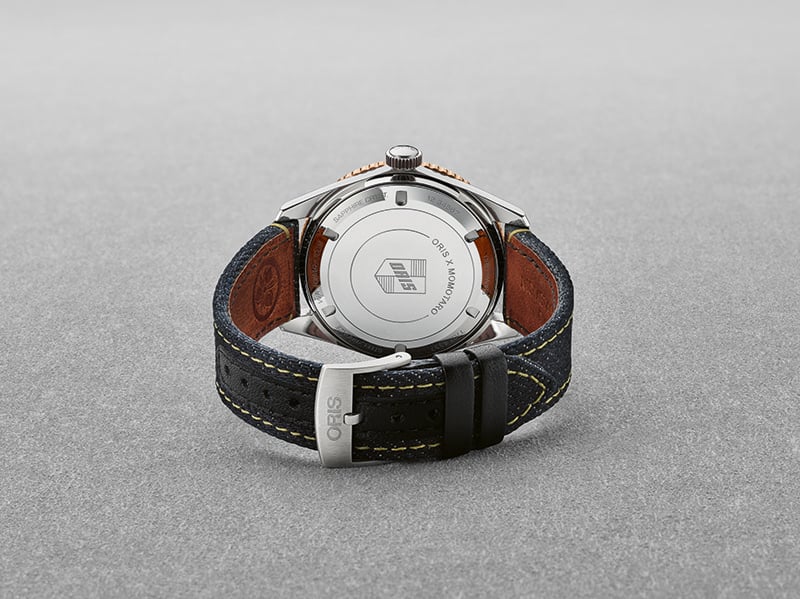 Filling out another niche in the Sixty-Five collection from Oris is a collaboration with an independent jeans manufacturer, Momotaro, based in Japan. The strap takes an off-cut of indigo denim with two white “battle stripes” on the buckle end of the strap.