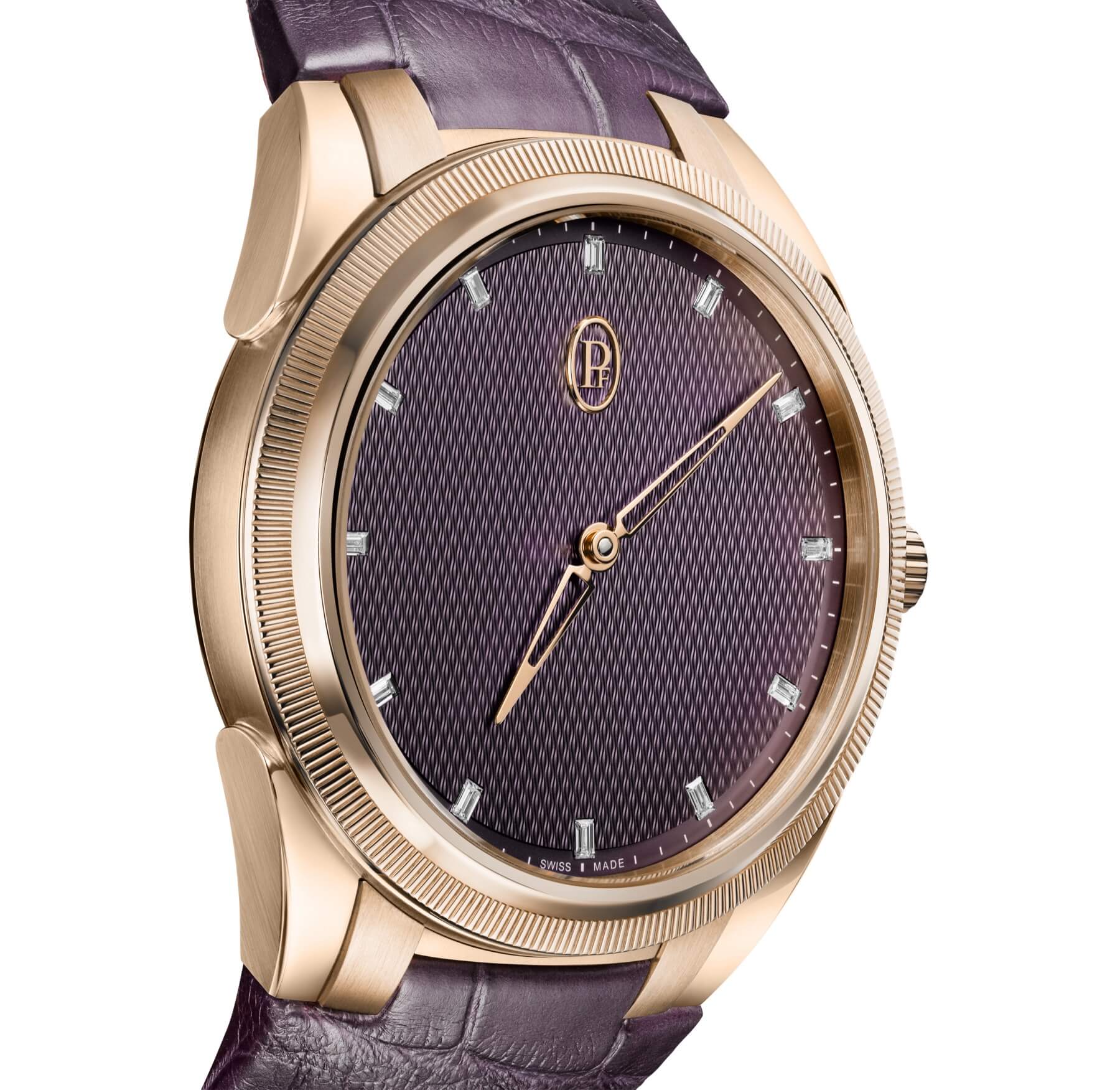 The two-tone model showcases a light gray dial adorned with 18K rose gold hand-applied index appliqués. I adore all shades of gray. And this particular lighter hue, which Parmigiani calls “sand gray,” has appeared in several models throughout its collection. In a captivating contrast, the second model presents a dial in a deep ruby color that harmoniously extends to the alligator strap. Its hour markers are hand-applied, rhodium-plated appliques set with twelve FG-VVS baguette-cut diamonds, weighing a total of 0.36 carats.