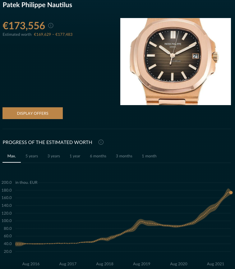 If you’re a fan of the brown, however, you may be too late to make a move. Though the Wempe website shows this model priced at just over €50K, Chrono24 tells very a different story. In 2021, it nearly doubled in price, and that trend doesn’t show any signs of slowing down. Though the hype may favor steel, this precious-metal Nautilus is certainly not a comparative bargain like gold Rolex models might be.