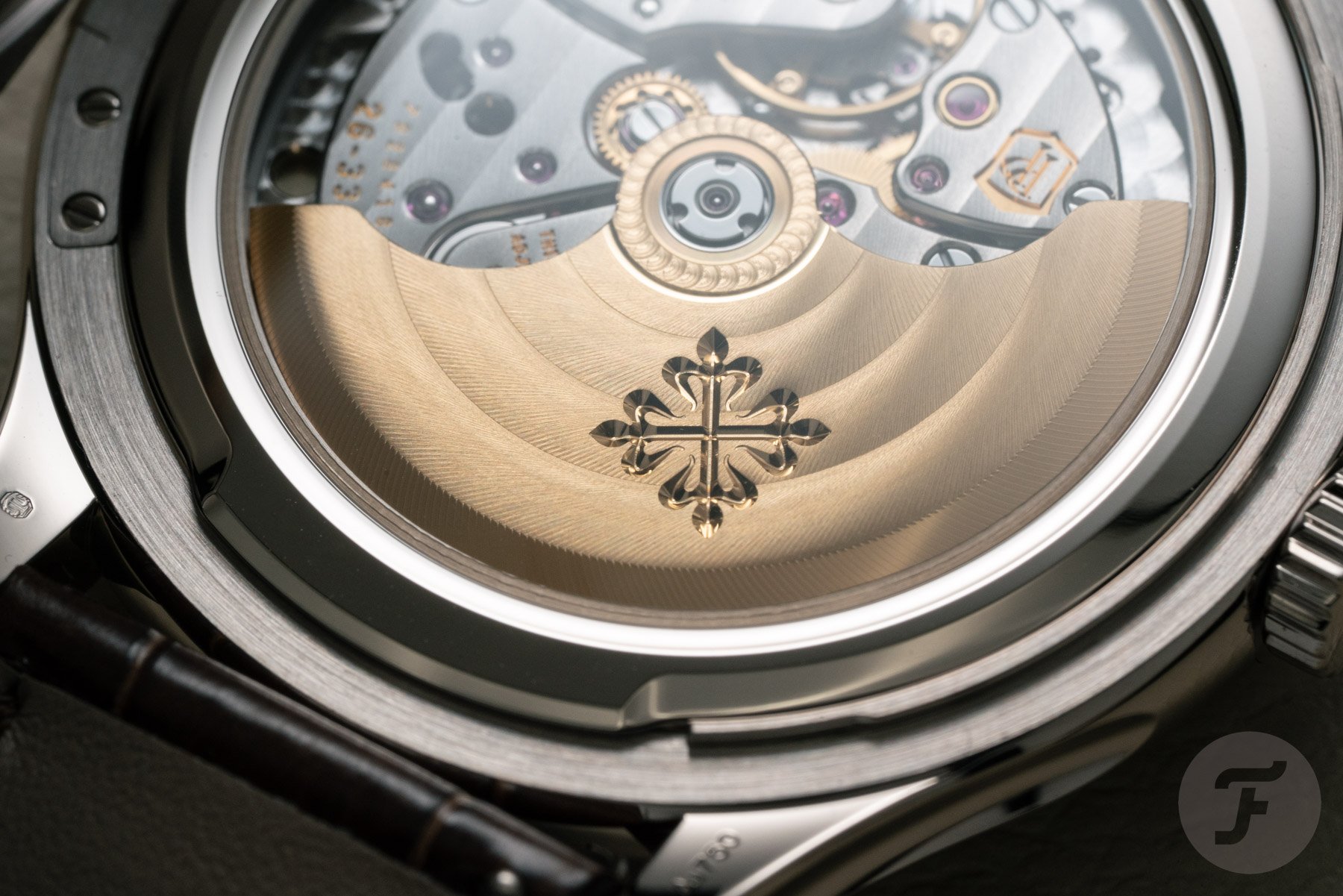 The main updates were a stop-seconds (hacking) mechanism and a more efficient winding system, featuring a redesigned unidirectional 21K gold rotor decorated with the Calatrava cross. The caliber operates at 28,800 vibrations per hour, has 29 jewels, and offers a 45-hour power reserve.