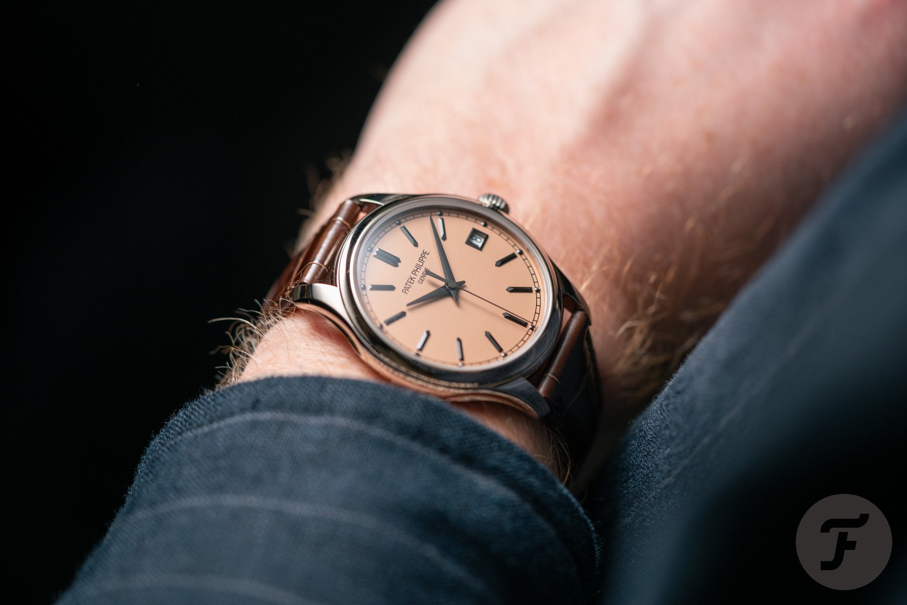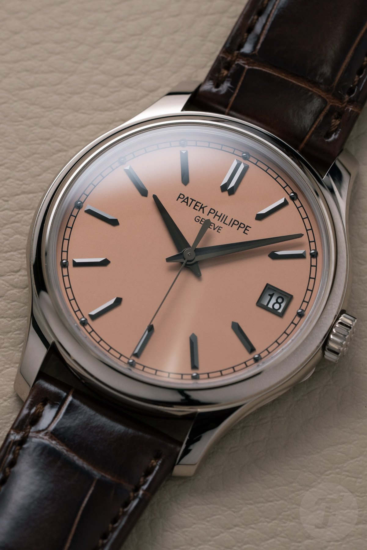 It also shows the great job the Patek Philippe designers did with the new Calatrava. It all starts with the simple addition of a black railroad minute track to the rose-gilt opaline dial that features small dot markers for every five-minute interval. As a result, the charcoal-gray white gold applied faceted “obus” hour markers move slightly inward.