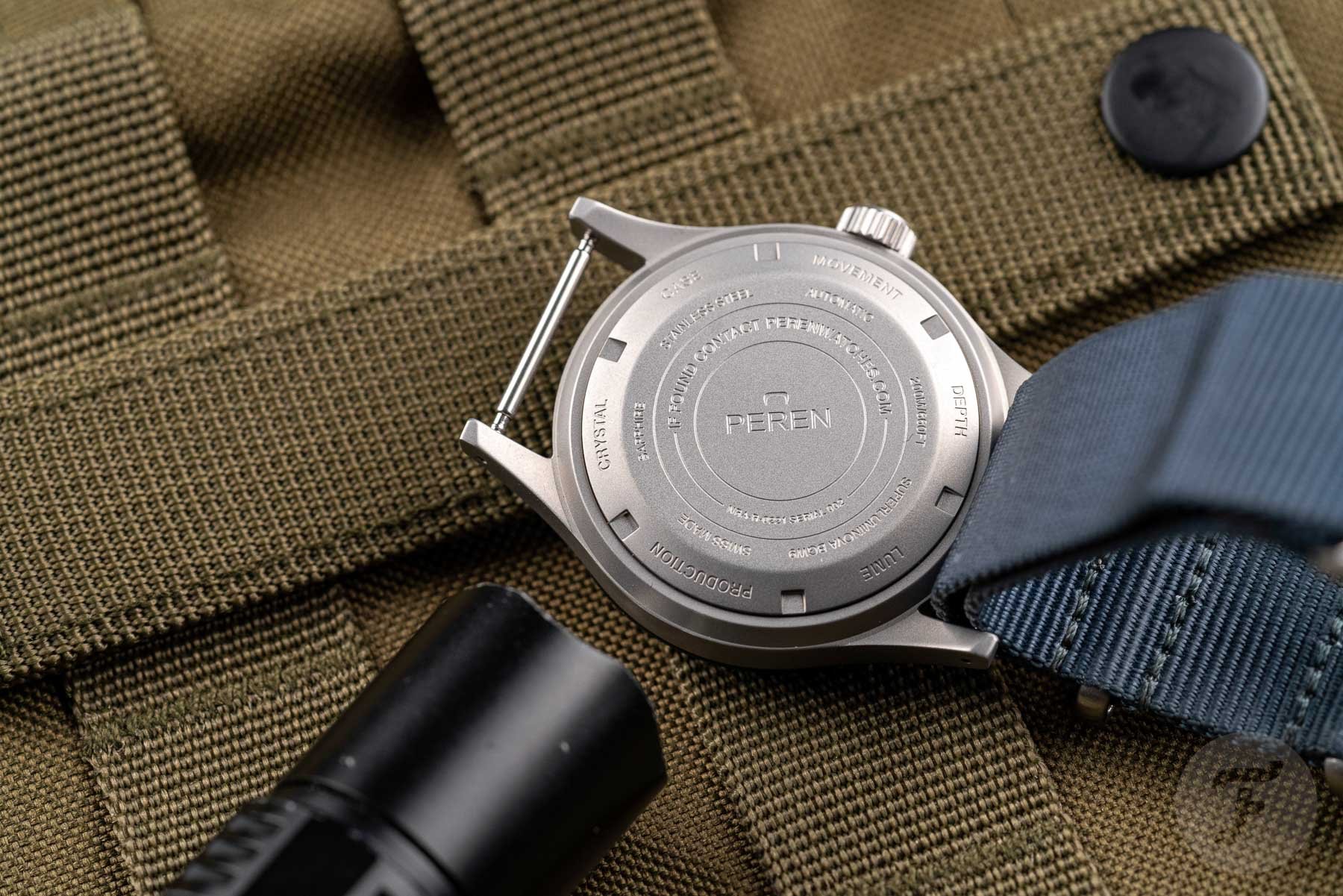 Its edges have a raw metal finish. This contrasts nicely with the black of the bezel and insert, and it matches the case and the oversized, signed crown. The crown is big, well-finished, and a joy to use. Thanks to its size, it’s in perfect harmony with the watch’s vintage lines, but is also extremely practical, as it allows the user to grip it even with gloves on. Details like this, which add to the functionality of the watch as a tool, are greatly appreciated. It shows that Peren didn’t just want to create a good-looking watch, they also wanted it to perform as a proper dive watch. On the flip side, you’ll find a nicely engraved solid case back.