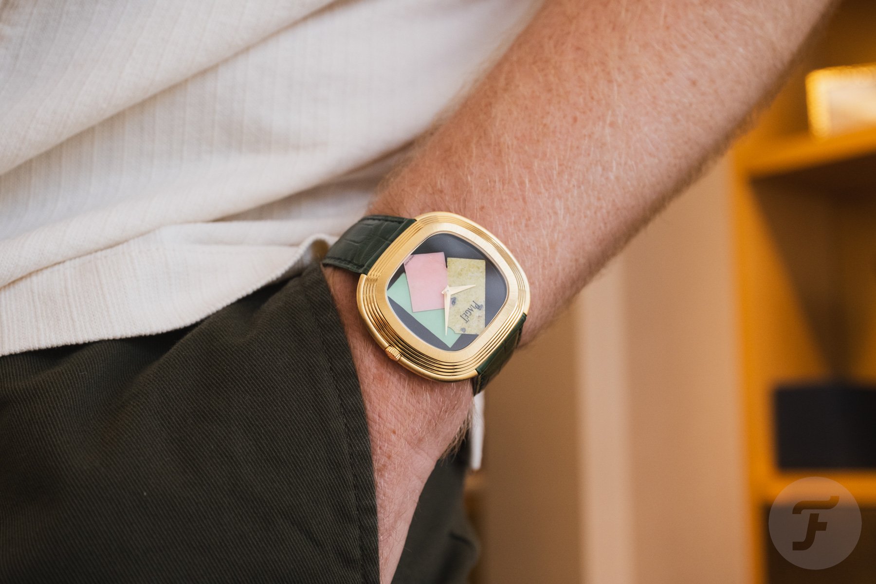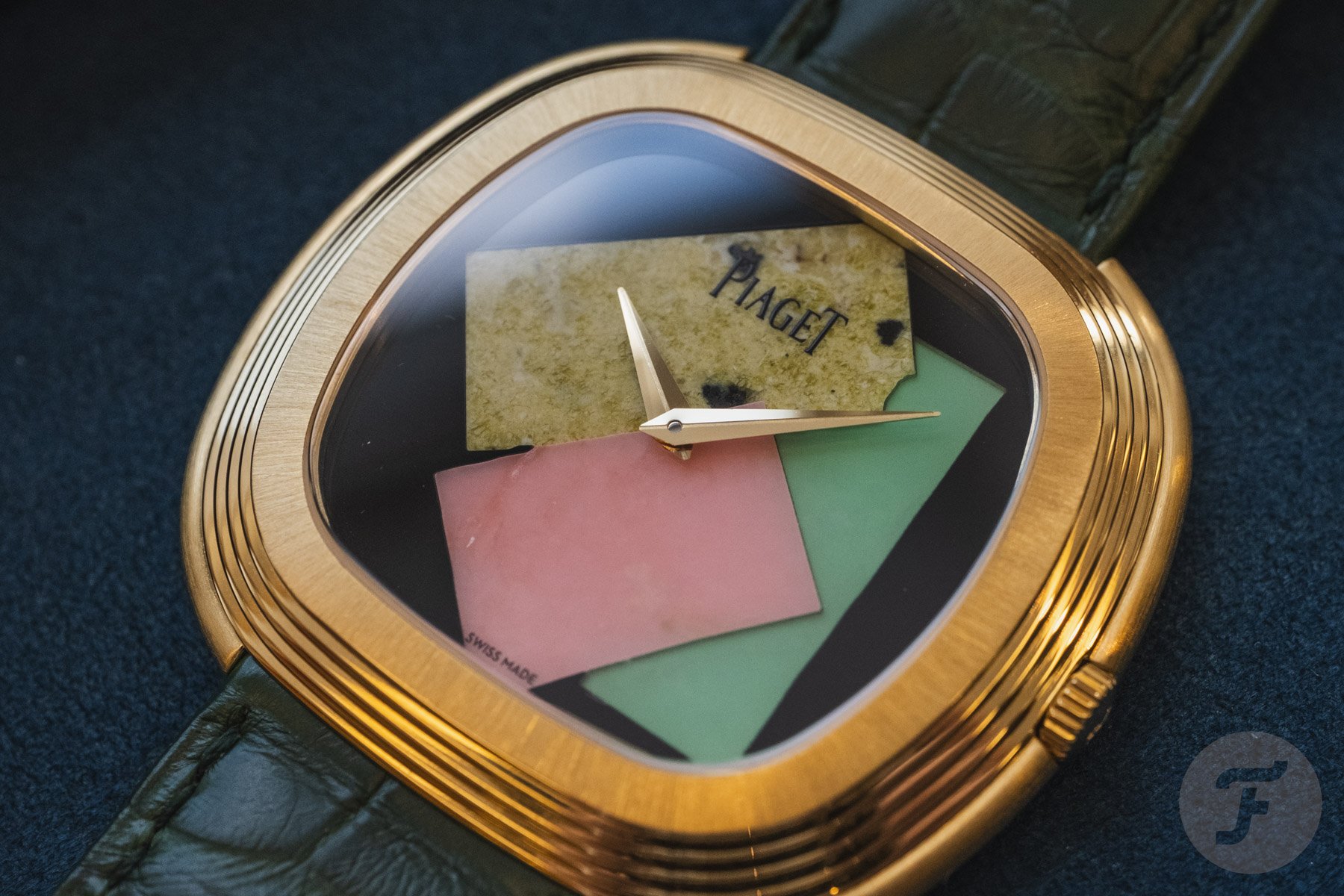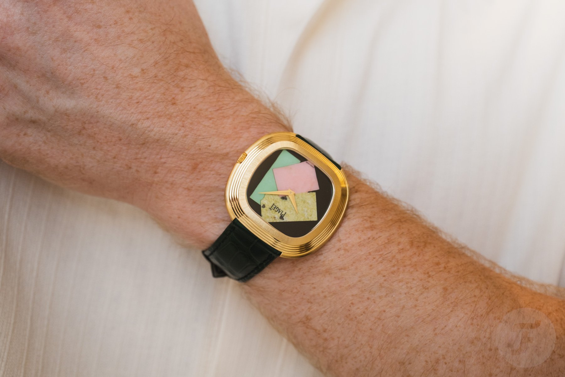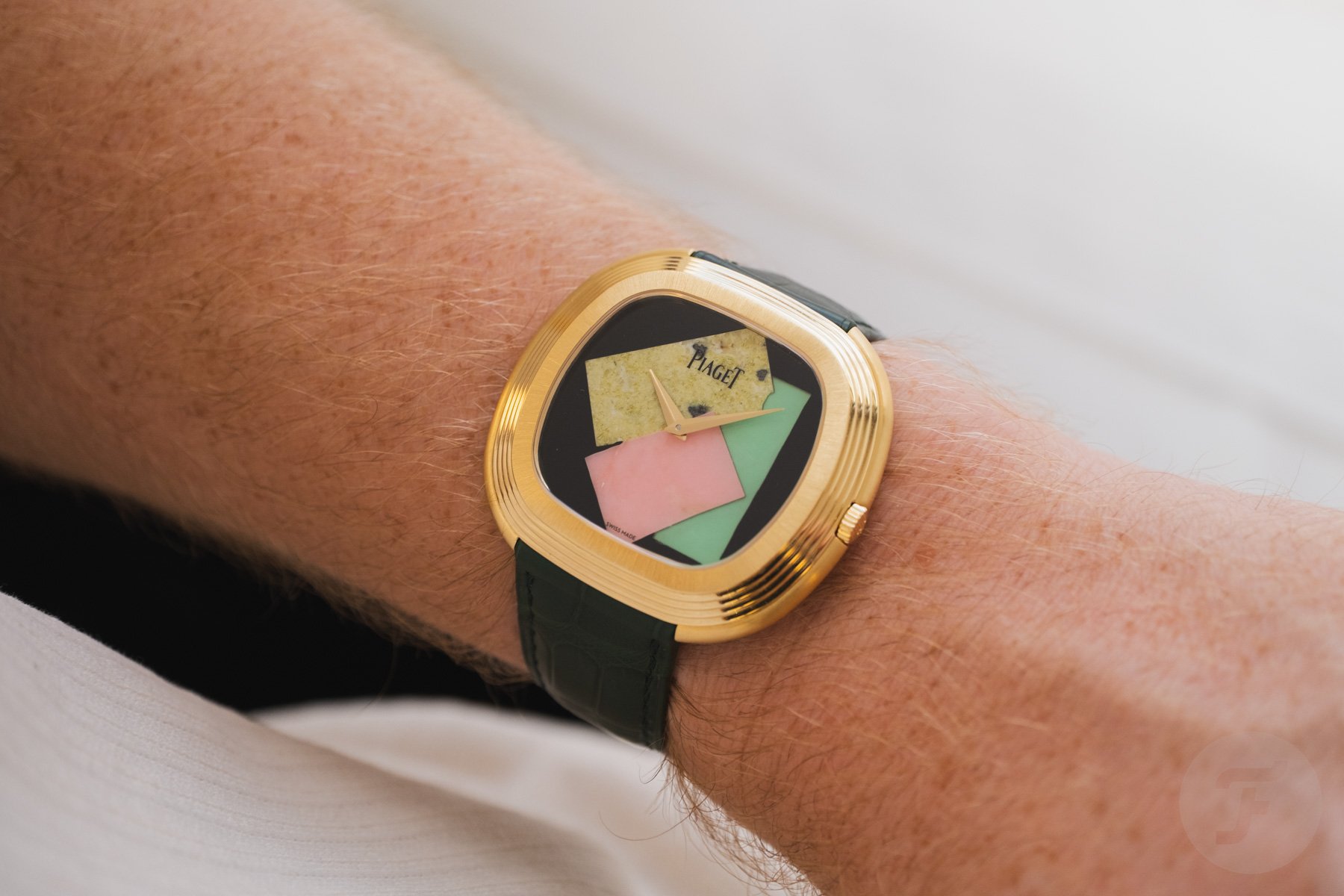 Andy Warhol once said, “Art is what you can get away with.” Does Piaget get away with the art watch you see here? In collaboration with the Andy Warhol Foundation, the Piaget Andy Warhol “Collage” Limited Edition bursts onto the scene. The watch is a limited edition of 50 pieces, each featuring a dial crafted from a marquetry of colorful ornamental gemstones arranged in an abstract composition inspired by one of Warhol’s famed 1986 Polaroid collage self-portraits, Collage. This edition follows the partnership announced in November, which revives the legendary “Andy Warhol” watch name. We had the opportunity to try on the latest LE at the brand’s boutique in Geneva.
