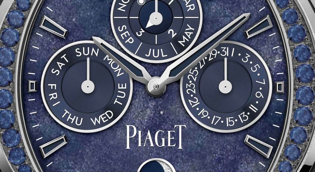 Equally “extralegant,” or perhaps even more so, is the second novelty, the Piaget Polo Perpetual Calendar Ultra-Thin in white gold. Gone is the green from the stainless steel model. This material upgrade brings with it a blue obsidian dial with inherent iridescence. Obsidian is a natural volcanic glass formed from the rapid cooling of lava. It is often black, however, according to Piaget, inclusions can form “when drops of mineral-rich sulfide liquid [become] trapped in the rock as it [solidifies].” These inclusions are very rare but are exactly what we see in the obsidian used for these dials, hence the intriguing shades. And as nature dictates, no two dials are the same, even if cut from the same piece of obsidian.