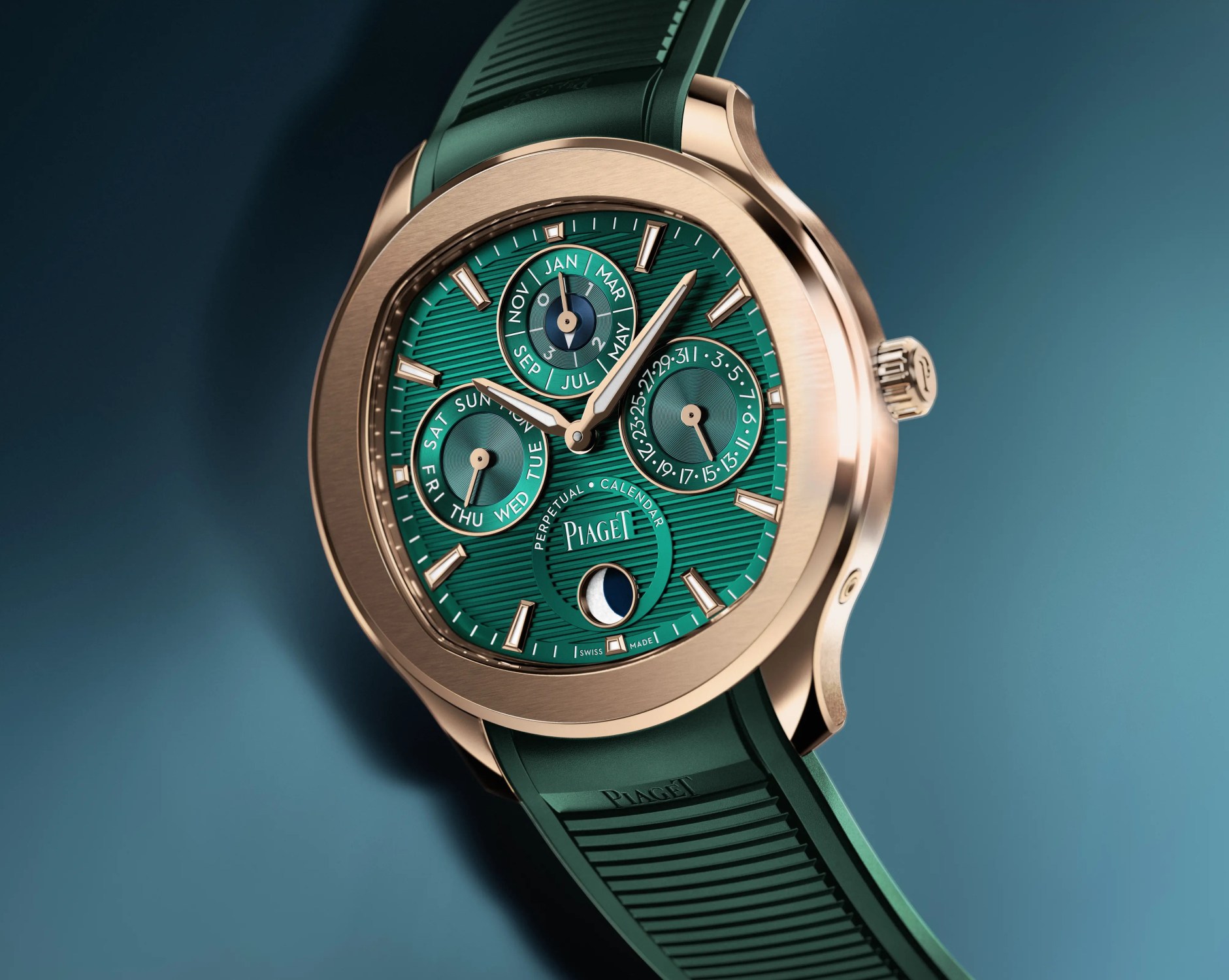 The Piaget Polo Perpetual Calendar Ultra-Thin in rose gold retails for CHF 72,500 (the price in euros will vary by country). It comes with a new interchangeable strap system, SingleTouch, along with a green rubber strap with a gadroon pattern on it.