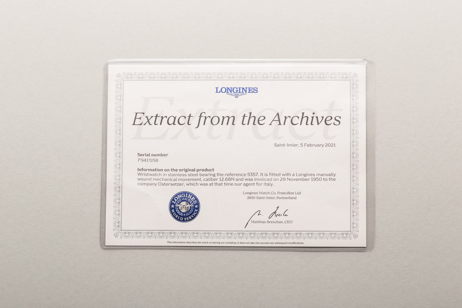When a watch looks as good as this 1950s Longines, the box and papers are the very last thing that matters. You will, however, will get an extract from the archives that shows the proud Italian provenance of this specific piece. The fact that it was delivered to Messrs Ostersetzer, Longines’s agent in Milan, also explains “Suiza” on the dial. The watch is in great condition for its age. The stunning silver dial is minimalism incarnate. With Arabic numerals lining the outer edge beside a subtle minute track and no text on the dial other than “Longines” and “Suiza” at 12 o’clock, it’s proof that less can indeed be more. Thin silver leaf hands and a beautiful seconds hand elegantly display the time.