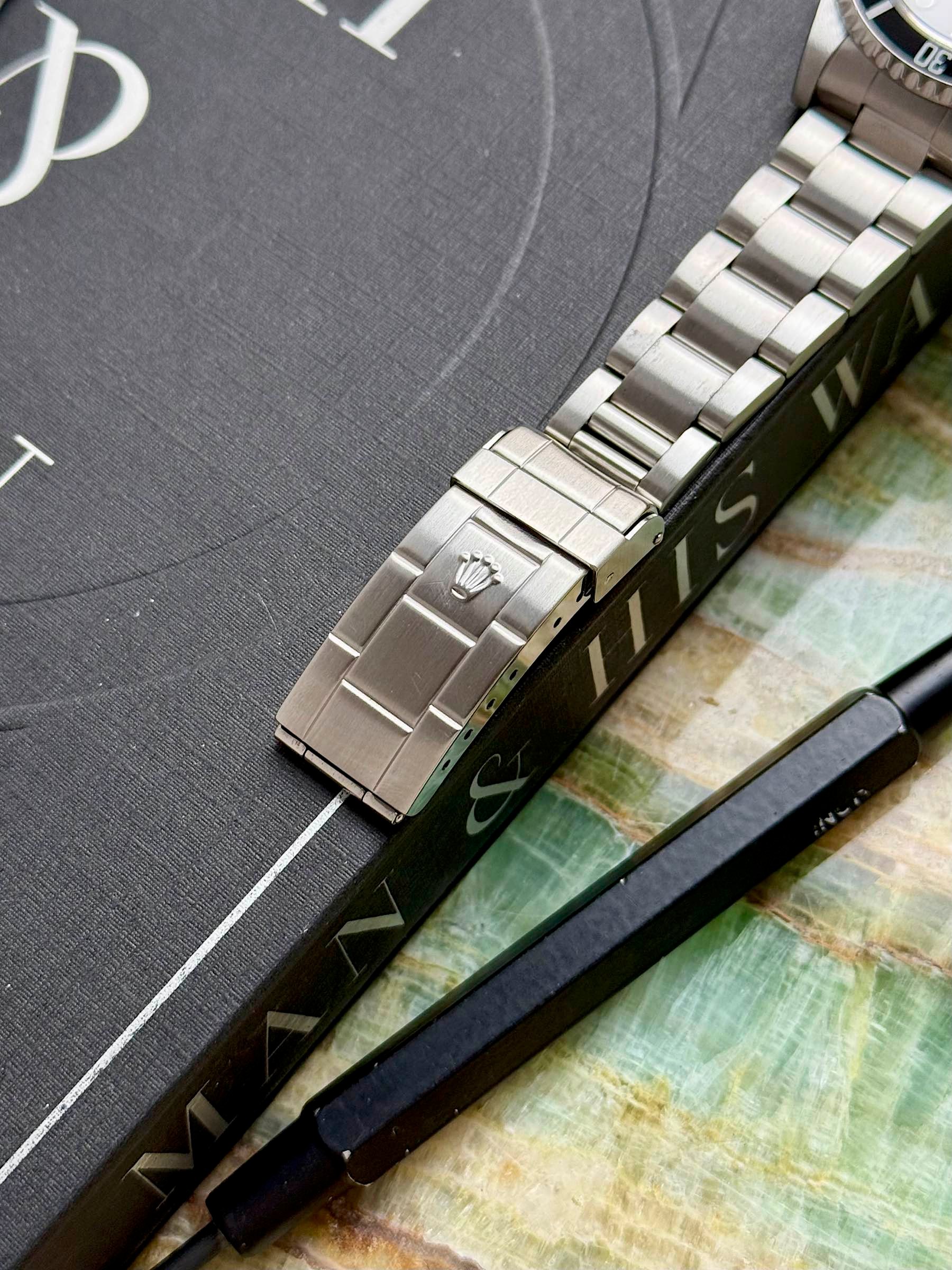 The trade-off is primarily visible in the bracelet. This older generation (1998–2012) features hollow center links and a thin clasp made of pressed sheet metal. Don’t mistake this for a weakness, though. They are built to survive. They just don’t have that lovely bank-vault-like feeling of modern Rolex bracelets. I found this pre-owned Rolex Submariner ref. 14060M in very good condition at Timeless Vintage Watches for €8,250.
