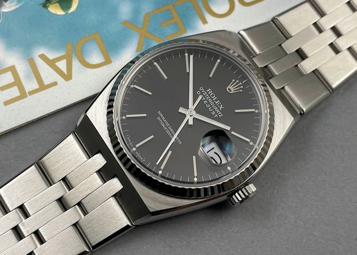 The 1987 ref. 17014 you see here runs on the Rolex quartz caliber 5035. For the longest time, people looked down their noses at these. Only recently did enthusiasts start to appreciate these watches for their seriously high-end quartz movements and unique designs. If you ask me, that attention is well deserved!