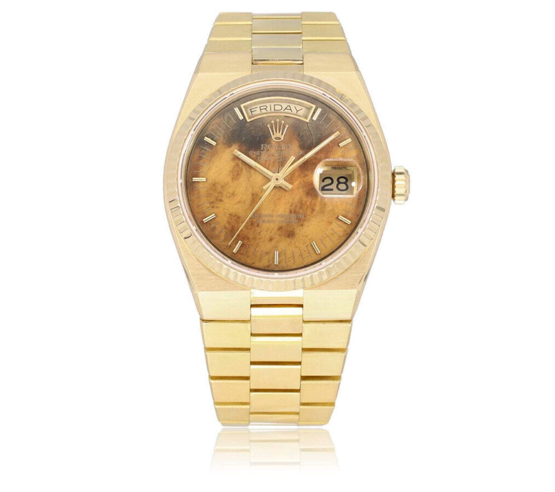 This one dates back to 1979, and it commands €12,750. Frankly, I find that very accessible for a full-gold Rolex with a wooden dial. Speaking of the dial, it is advertised as a spider dial. This means the top coat of the lacquer cracked, forming fine lines hovering over the wood. As always, one person’s decay is another’s patina; I quite like it.