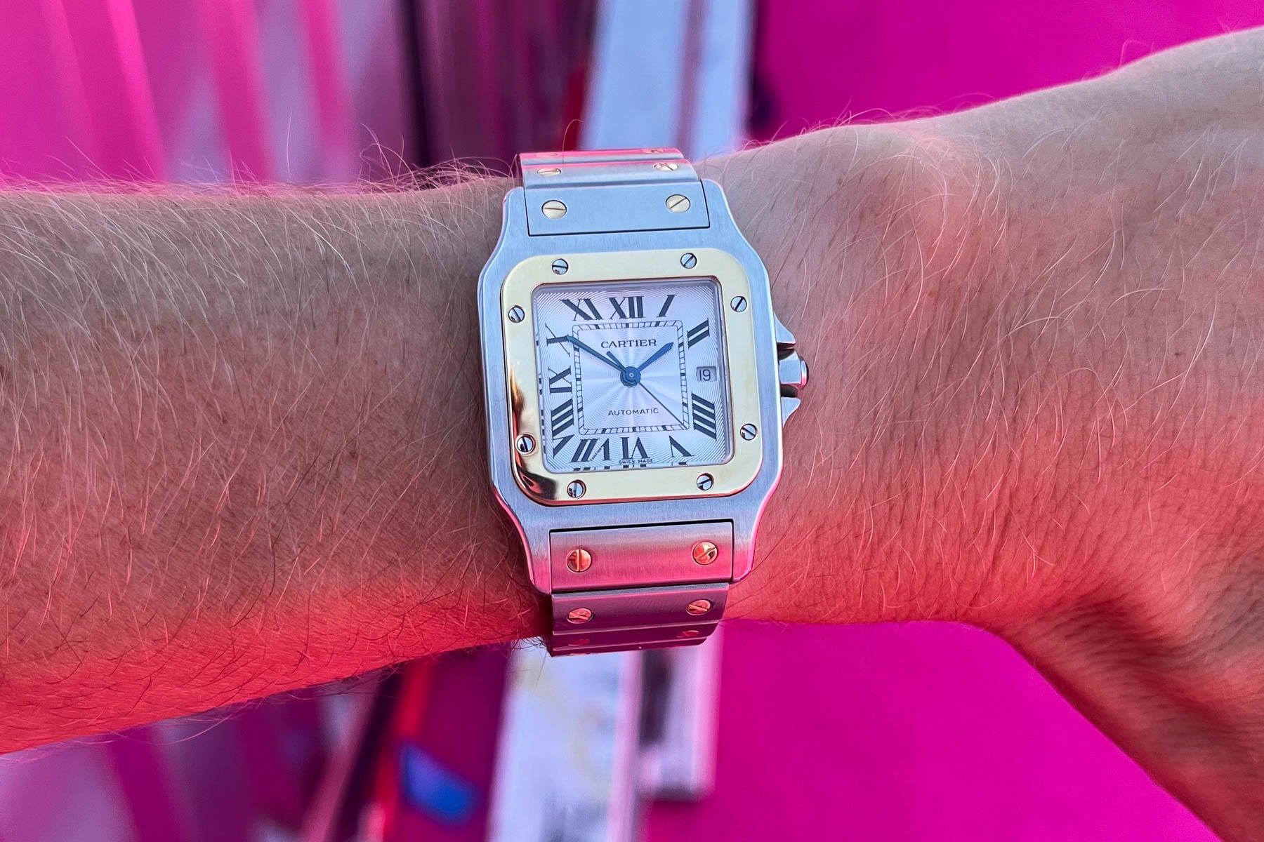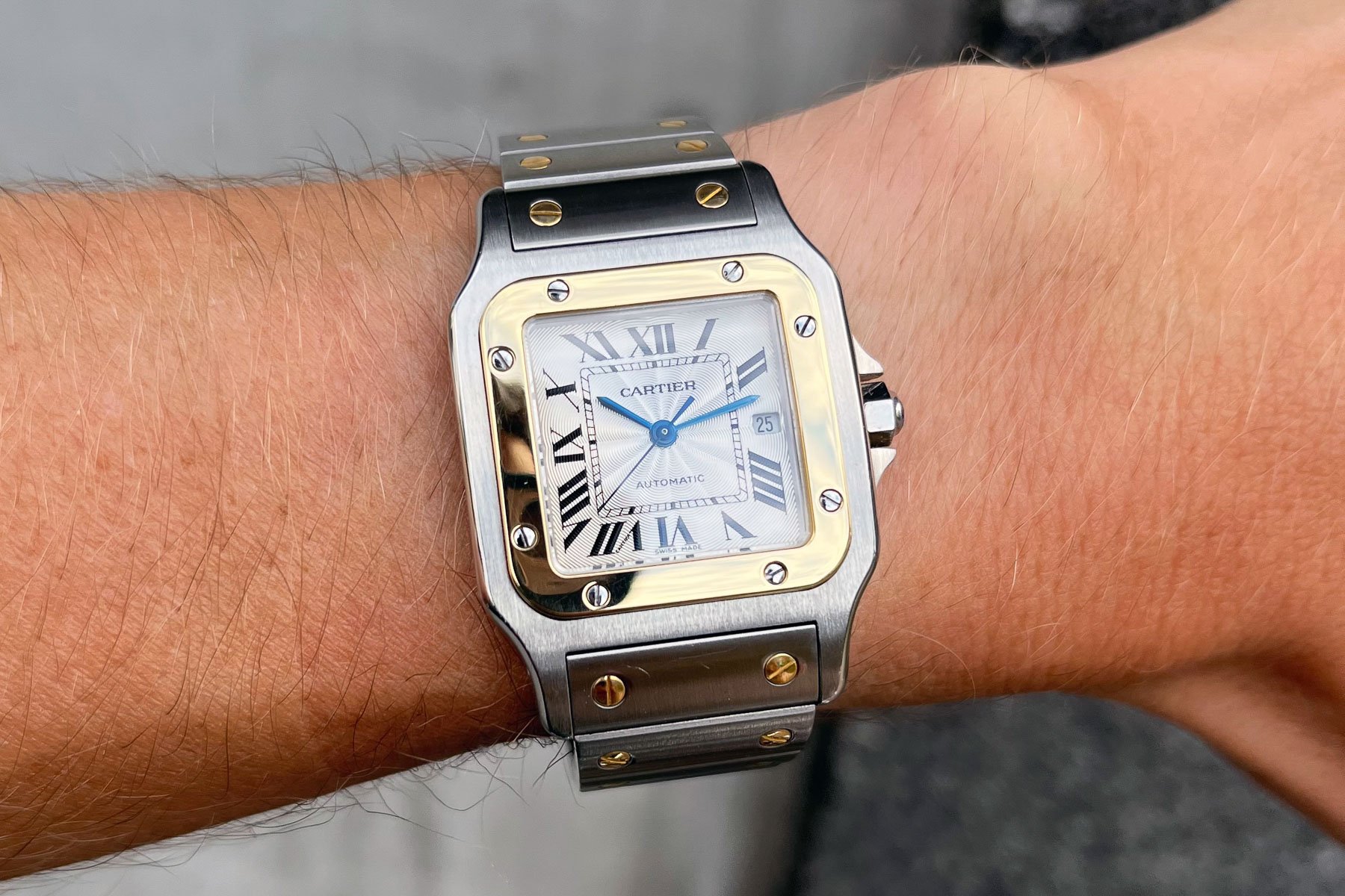 The Santos Galbée has a rectangular, slightly curved case. It also retains the classic square bezel, which I prefer over the more fluid bezel in the current Santos. The crown guards hug the blue-cabochon-set crown, a typical feature of Cartier watches. Even though a lot is happening here, the design is so well done and balanced. What else would you expect from a brand that is the pinnacle of iconic watch design?