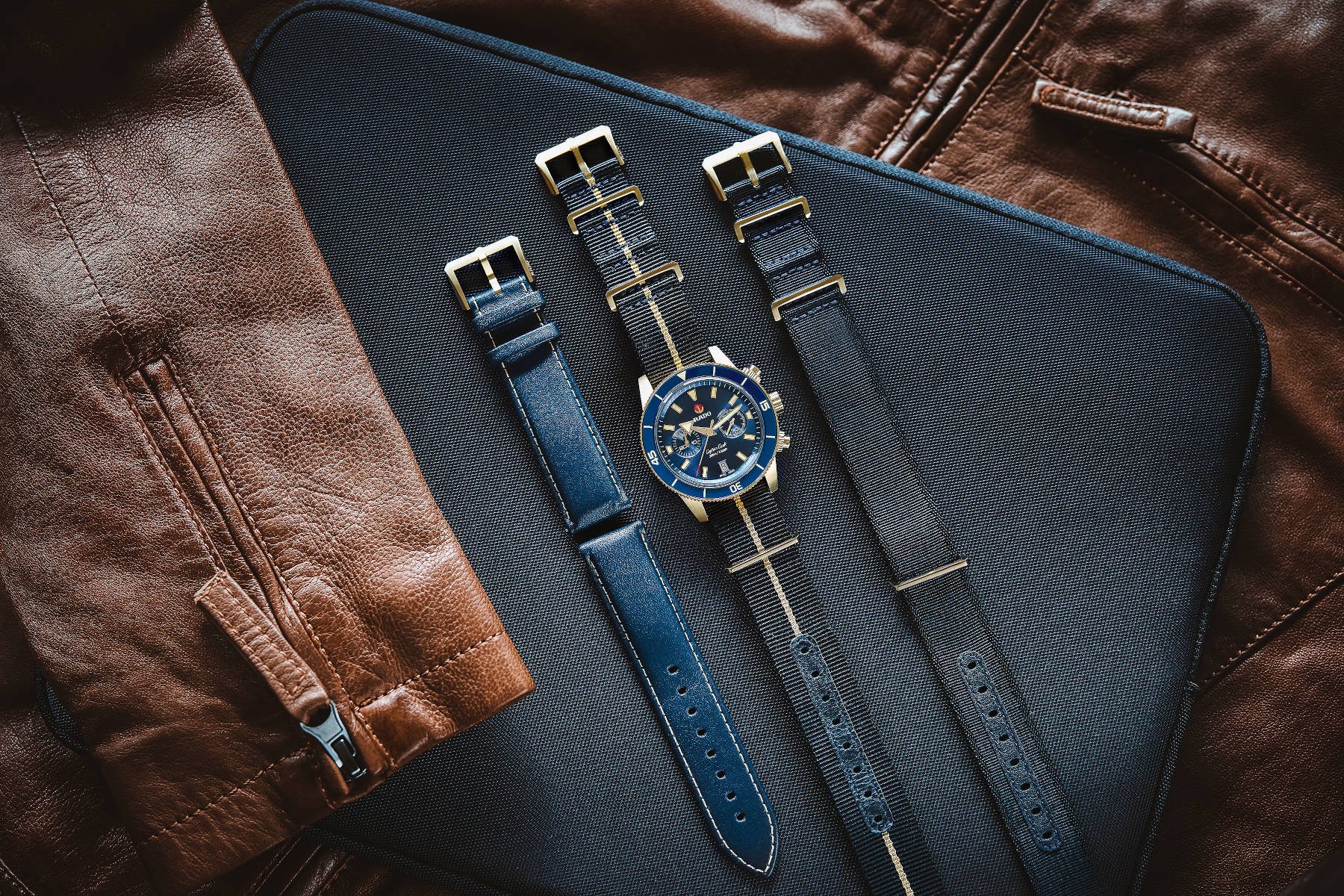 Regarding case material, prospective buyers have a choice of either polished stainless steel or circular-brushed bronze. A screw-down crown and pushers and screw-down solid case back help give the watch its 300m water-resistance rating. That’s pretty darn good for a chronograph, but it’s no less than you’d expect from a member of the Captain Cook family! Both of the stainless steel models come with a matching stainless steel bracelet (polished with brushed center links), a leather strap, or a NATO strap with steel hardware. The bronze model comes with a leather strap and two NATO straps, all with matching bronze hardware.