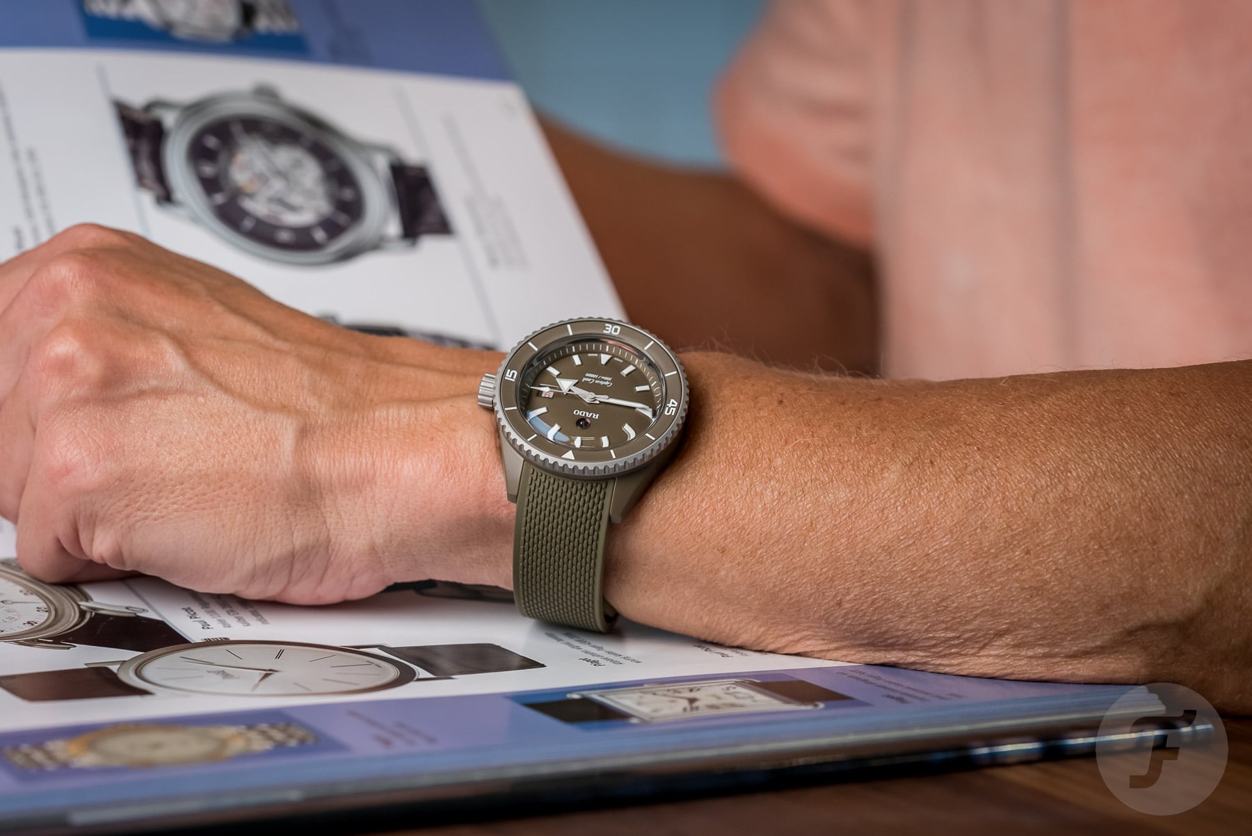 Since I mentioned ComaDur and its mind-boggling plasma oven, I have to tell you two things before I tell you how the Captain Cook High-Tech Ceramic wears. First, next Monday, there will be an in-depth article about the workings of that ceramics-specialist company. And second, this Rado Captain Cook High-Tech Ceramic in matte olive green experienced temperatures of “just” 1,450°C for a whole week (!) during its creation process. Still pretty hot stuff, right? Both the production method and the watch, I would say. Especially on the subtly textured, integrated rubber strap with folding clasp, this particular Captain Cook looks technically dapper.