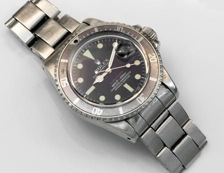 John Holbrook recently bought this Rolex Submariner ref.1680 (approx. 1972), with red printing on the dial. As you can see on the photo below, the watch is quite worn. The bezel is incomplete (mind the missing luminous dot) and the bracelet is stretched. The watch case is still sharp edged, which means that this watch hasn’t been polished much before. Especially on older Rolexes, the sharp edges are gone most of the time. This is mainly due to polishing of the case by a non Rolex service center. A lot of watchmakers who are asked to buff the watch to get rid of all scratches, polish a bit too fanatical. The movement in this watch is caliber 1570, seems to be in good condition and is still running fine after all these years.