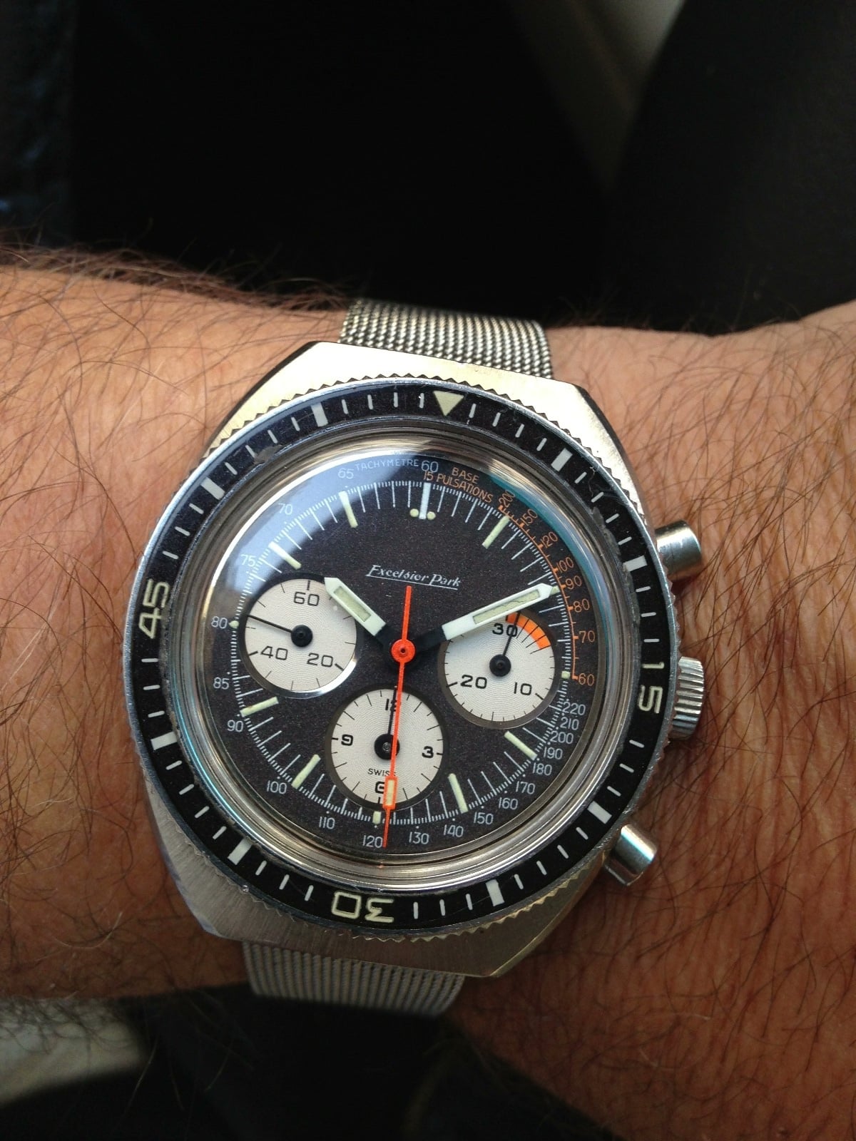 If you want a pure-bred example, you may go the extra mile and find one branded Excelsior Park. These are even harder to get than Gallet-branded models. Also, note that EP models have a pulsation scale instead of a telemeter. If you ask me, it’s cleaner and nicer, but it isn’t branded Gallet, which is much more important to me. The Girard-Perregaux fans may have their logo too. I didn’t know there was also one branded Gruen, with no tachy or tele scale. In addition, keep in mind that the GP and Gruen models have different bezel scaling. Thanks, Pedro, for helping me out with this market overview.