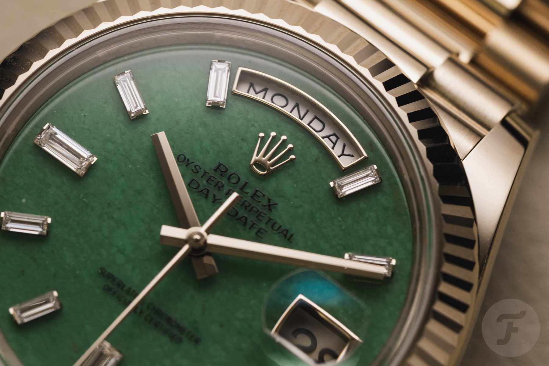 One of our first meetings was with Rolex. And although the Rolex press releases that we received before the Watches and Wonders fair opened hadn’t looked very promising, the live meeting where we could handle the watches turned me around on some of them. Although I like the Oyster Perpetual with its colorful Jubilee dial, the new green-dial Datejust, and, heck, even the new Yacht-Master II (which is actually better than its predecessor), it was the Day-Date with its green aventurine dial that made me smile the most. Natural aventurine like this is often green, but most aventurine dials we see in watches use blue aventurine glass, which is a synthetic material.