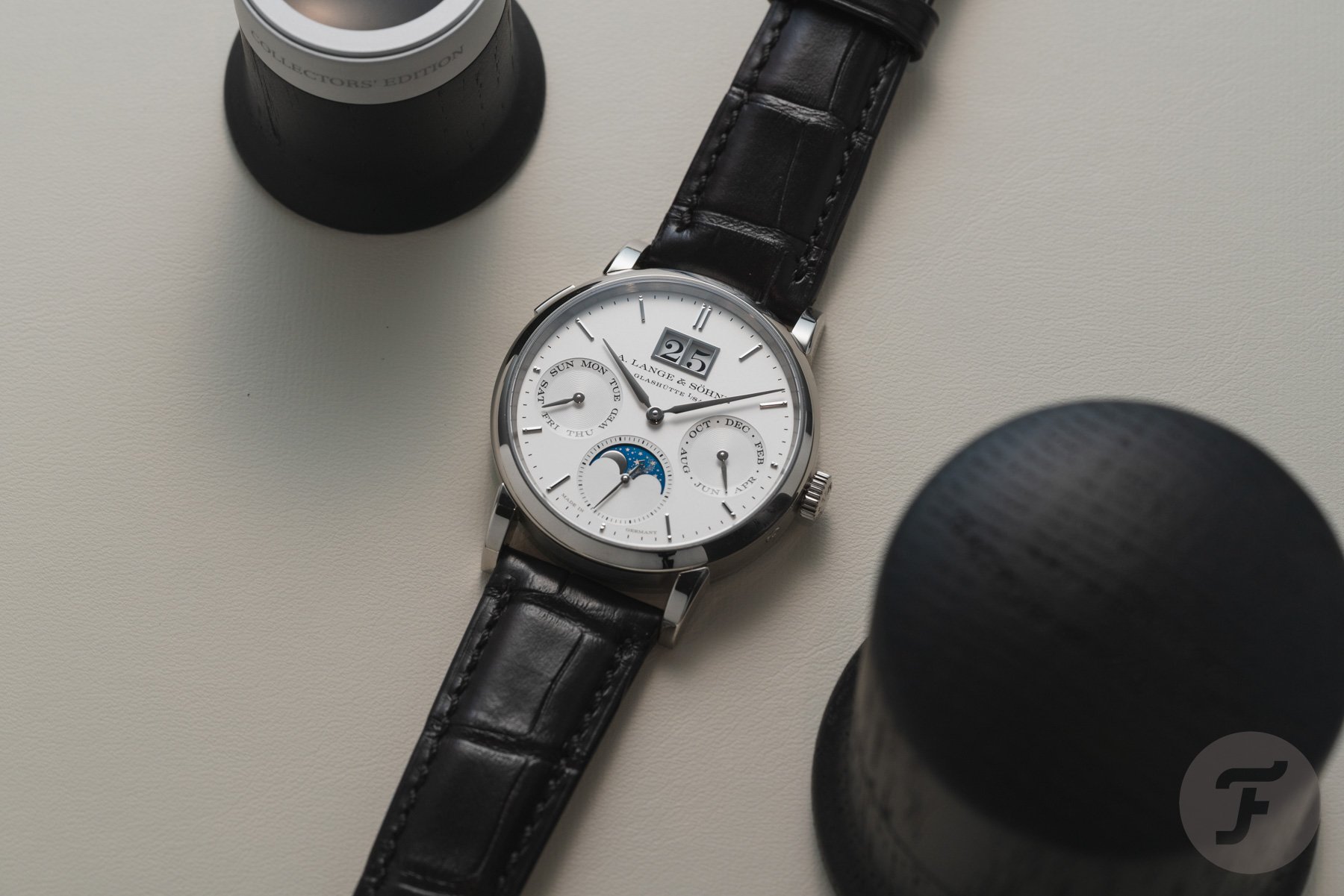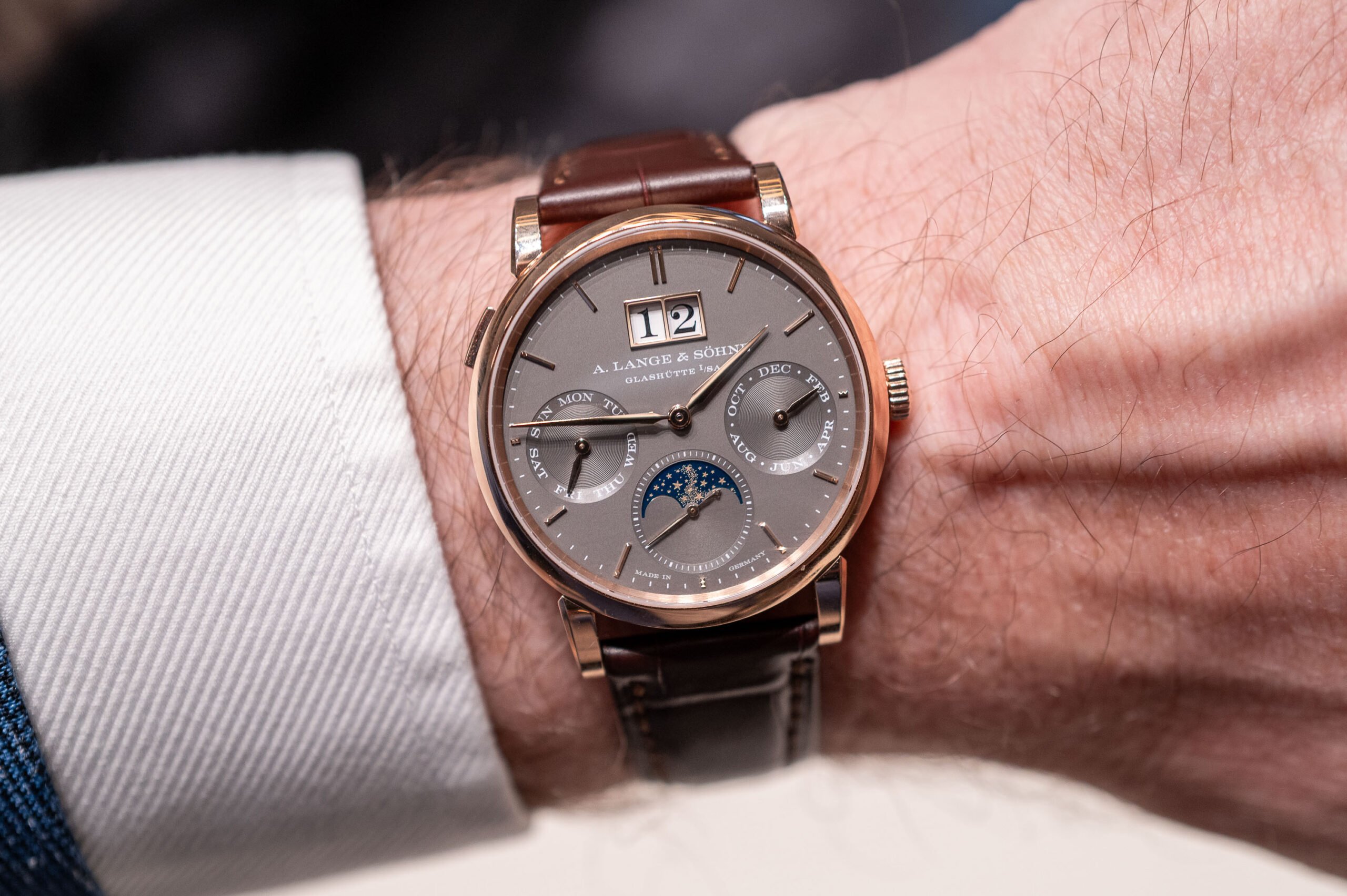 The next heavy hitter is the A. Lange & Söhne Saxonia Annual Calendar, available in white gold and rose gold. This is a 36mm annual calendar with a 9.8mm profile, and I found it extremely pleasant on the wrist.