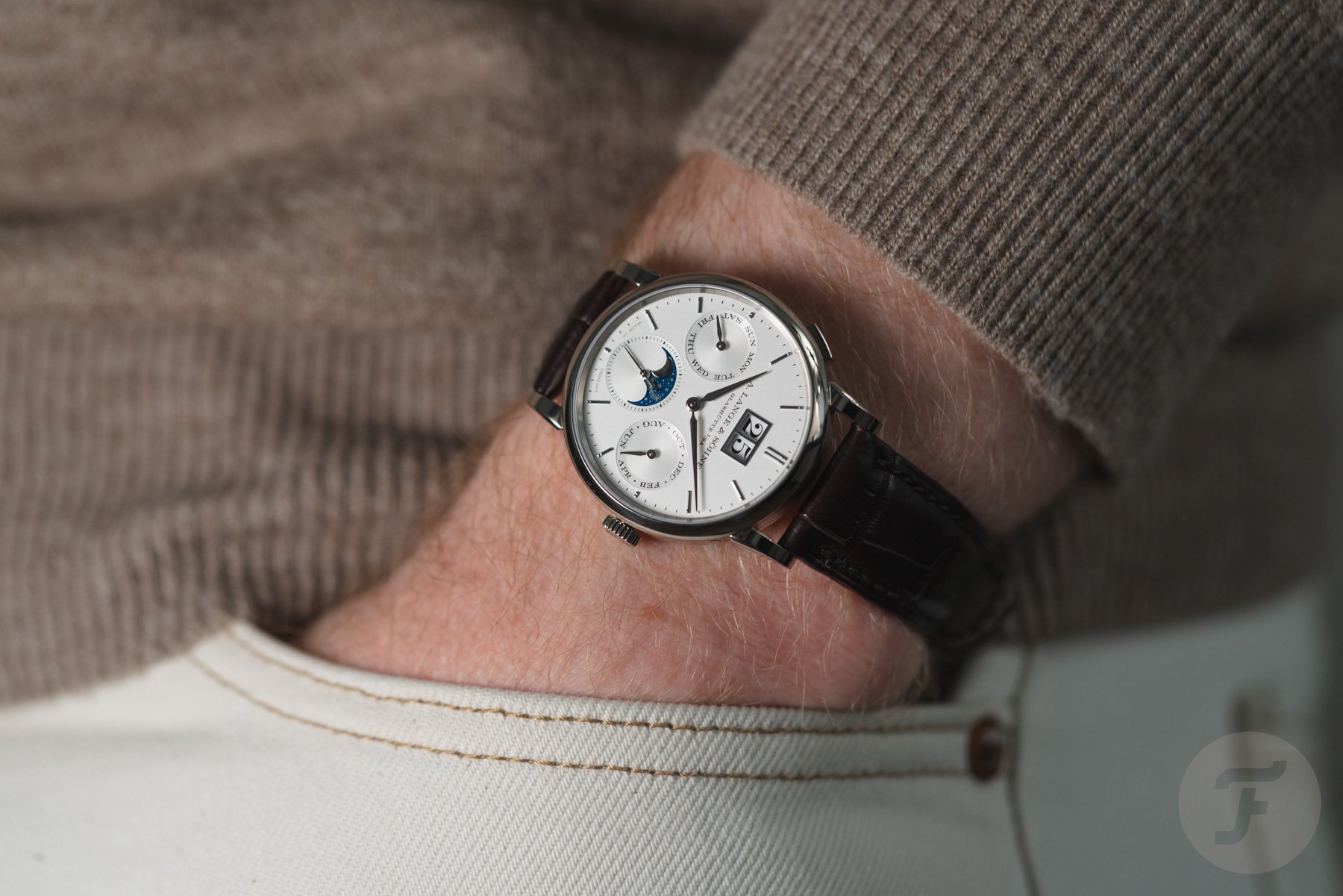 This watch was the talk of the town at Watches and Wonders all week, and since my appointment with Lange was my last one on my final day there, I had to wait quite a while to see what the fuss was about. Once on the wrist, I completely understood the positive noise around this watch. It looks great, wears well, and, on top of that, the clever watchmakers at Lange built in a safety feature to the movement so it is hard to mess up the calendar.