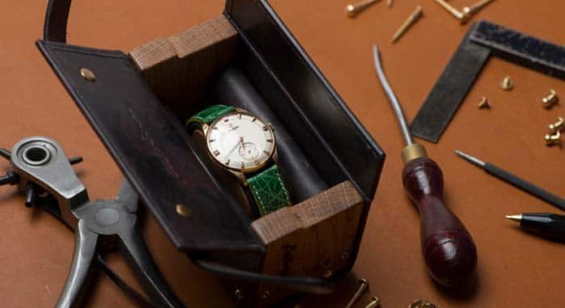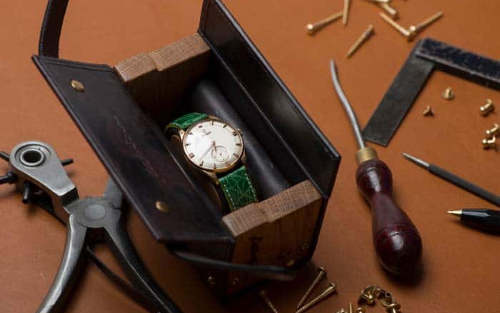 The watch case is fully hand crafted and comes available in a variety of leather and hardwood combinations, like American black walnut, Scottish oak and Scottish elm. A full-grain leather cover is fastened by polished brass screws. Inside the case, a padded nubuck piece holds the watch, with it’s face fully protected.