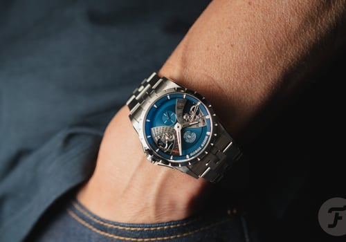 As I suspected, the 40mm Excalibur Biretrograde Calendar wears effortlessly. The case’s moderate proportions and the perfectly matched multilink bracelet make it happen. The Cosmic Blue color sits somewhere between dark blue and electric blue. I was afraid it would look a bit too cold and harsh, but it doesn’t; it truly has cosmic depth. It matches the brushed and polished steel case and bracelet’s informal, sporty look and feel very well.