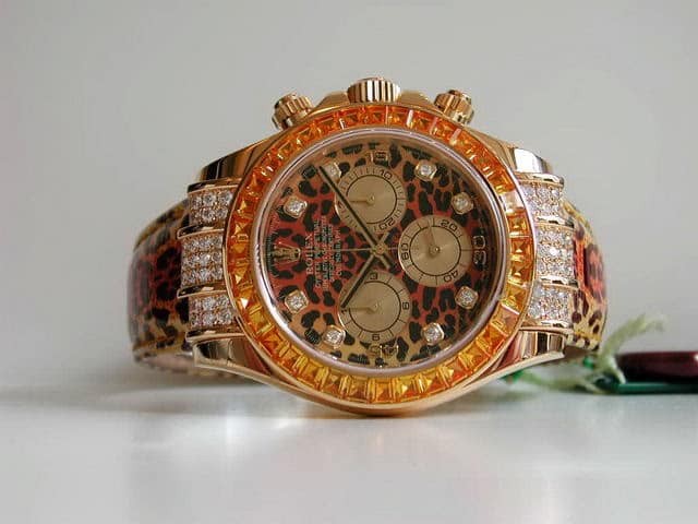 The strap also had a leopard print to match the dial, and the gold end-pieces were set with brilliant-cut diamonds. The Rolex Daytona Leopard reference 116598SACO can still be found on the pre-owned market and at auctions from time to time, and prices are a bit north of $50.000USD.