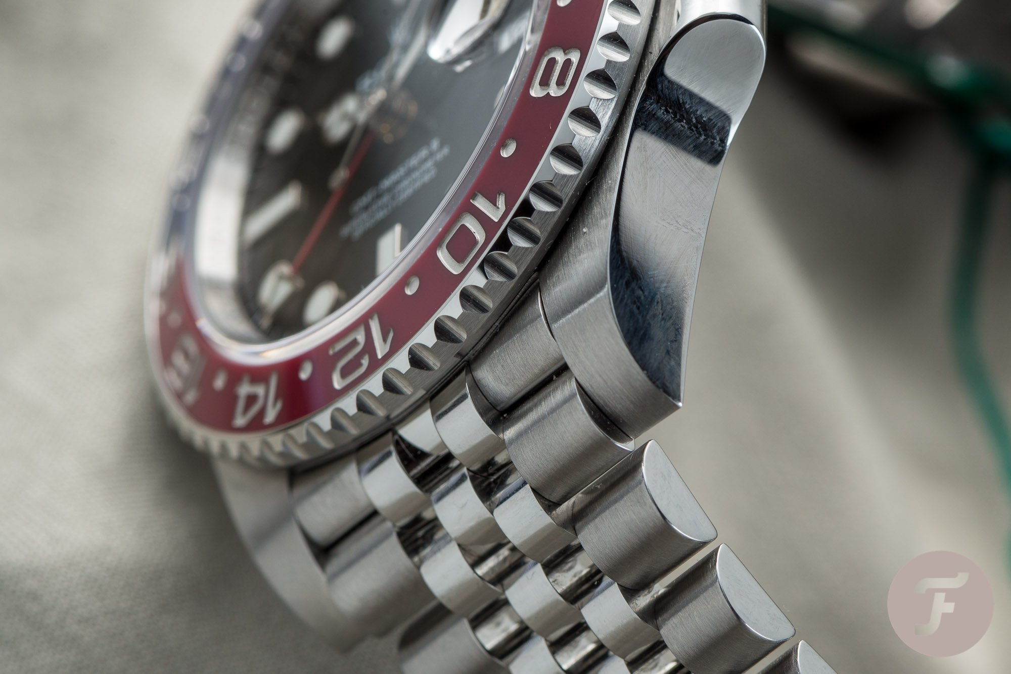 In the past, if you were considering a Rolex Submariner or GMT Master II, case size was far more of a differentiator. Prior to the release of the first maxi-cased GMT (the all black), the world timer came in a slimmer, albeit still 40mm, case with a smallish Twin-lock crown. The Submariner, on the flipside, was thicker and came with a larger crown. This made the GMT easier to wear with a dress shirt and fit the image of the spotlessly dressed commercial airline pilot that Rolex always liked to mention in its ads. The GMT was also available with either an Oyster or a Jubilee bracelet and that allowed one to choose a more or less formal look as well. Subs, by contrast, were bulkier and far more “toolish” looking. I’ve mentioned it before, but they were deemed as big, heavy watches up until the Panerai outbreak. Now, though, Subs and GMT’s look pretty darn similar. They both have thick-lugged maxi cases, massive Trip-Lock crowns, and their thicknesses only differ by 0.5mm! I’d guess that even Rolex noticed that things were looking awfully similar and this may have prompted them to reserve Oyster bracelets for Subs and Jubilees for GMT’s. When considering bracelets, it’s hard for me to pick a winner here because Rolex does sublime work on both. Lately, though, I’ve taken a real shine to the supple Jubilee. Sure, it’s a more elegant look, but is it ever comfortable!