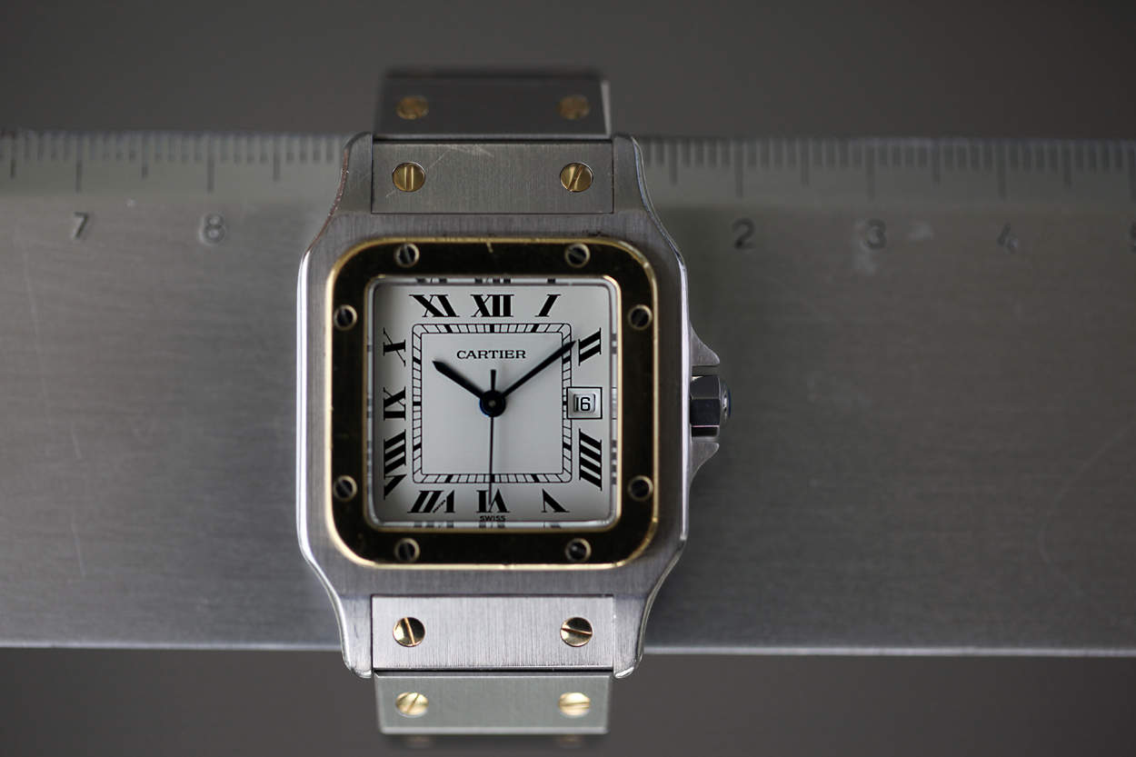 Cartier’s decision, now 37 years ago, to release a steel/gold and therefor more commercial and affordable variation on their first mens watch, the Santos Dumont, was more or less, a down grade of the prestige Santos Dumont model in 18k gold. It was quite a departure for the brand, that used to have a very elegant and classic watch collection, in precious metals only.