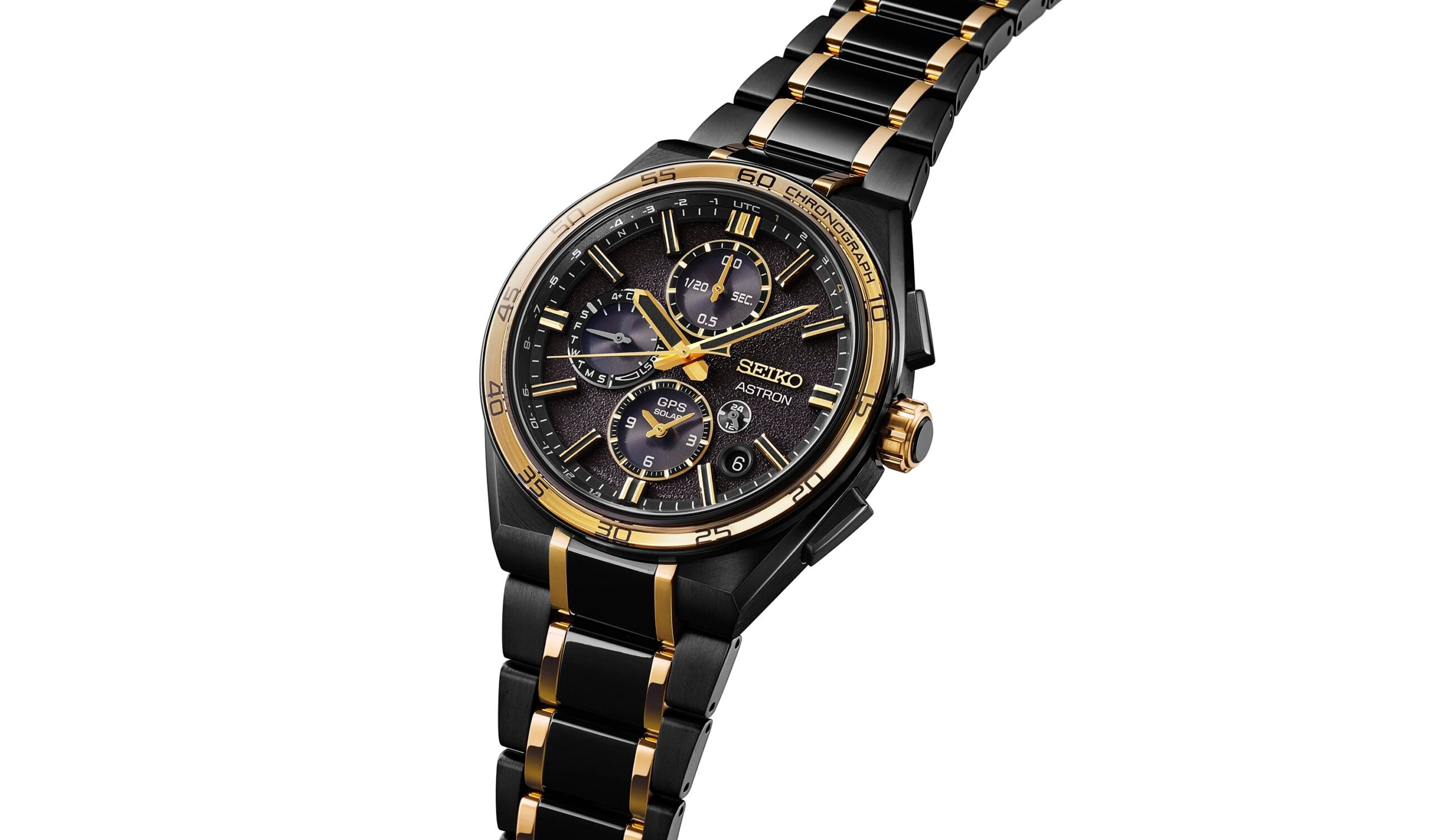 The final watch in this quartet of 145th-anniversary models is a variation of the Seiko Astron GPS Solar Dual-Time Chronograph. This version follows the SSH187 that Thomas wrote about late last year. This new version features a 44.1 × 14.4mm blacked-out titanium case accompanied by a black titanium bracelet with gold detailing. Topping the case is a titanium bezel with a gold-colored sapphire crystal insert. This matches the gold-colored crown and intermediate links in the bracelet. Additionally, the textured dial features a gold-colored Seiko logo and matching indexes and hands.