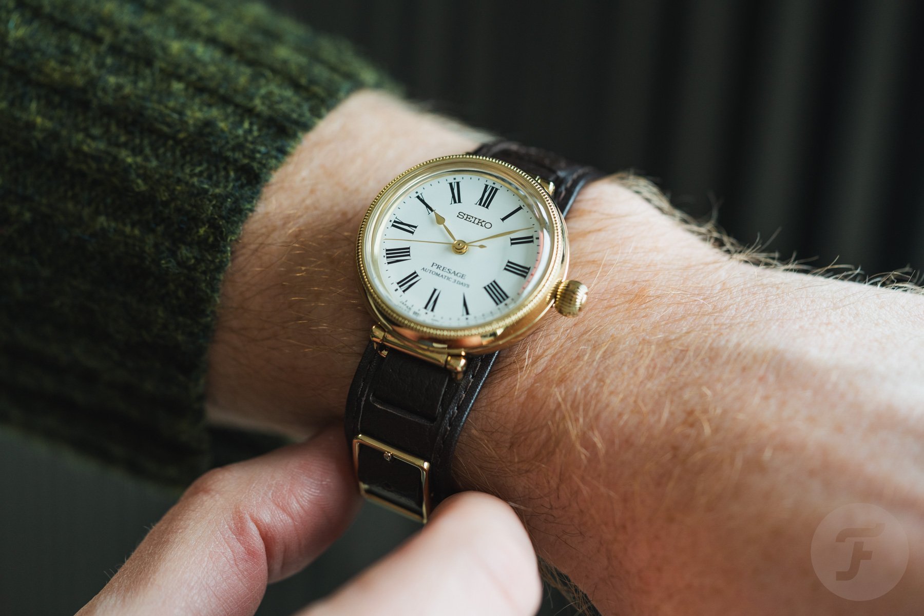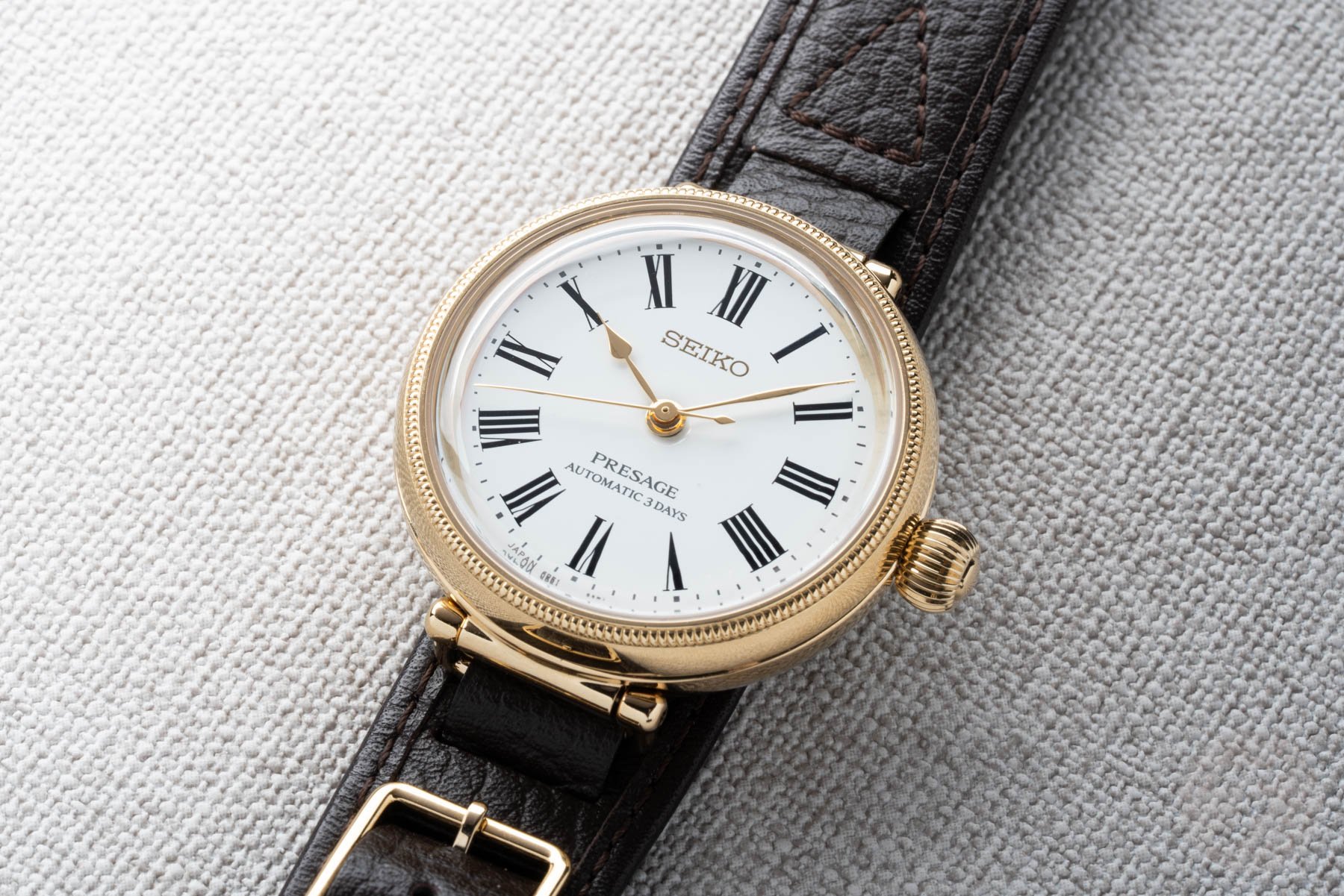 The 35mm case has a 12.3mm profile and a 50m water resistance rating. Inside it lies a lovely and smooth white enamel dial featuring slender black Roman numerals. The Seiko logo on the dial is executed in gold and corresponds with the gold-colored handset. Fittingly, the dial and hands are protected by a box-shaped crystal, further enhancing the vintage feel.