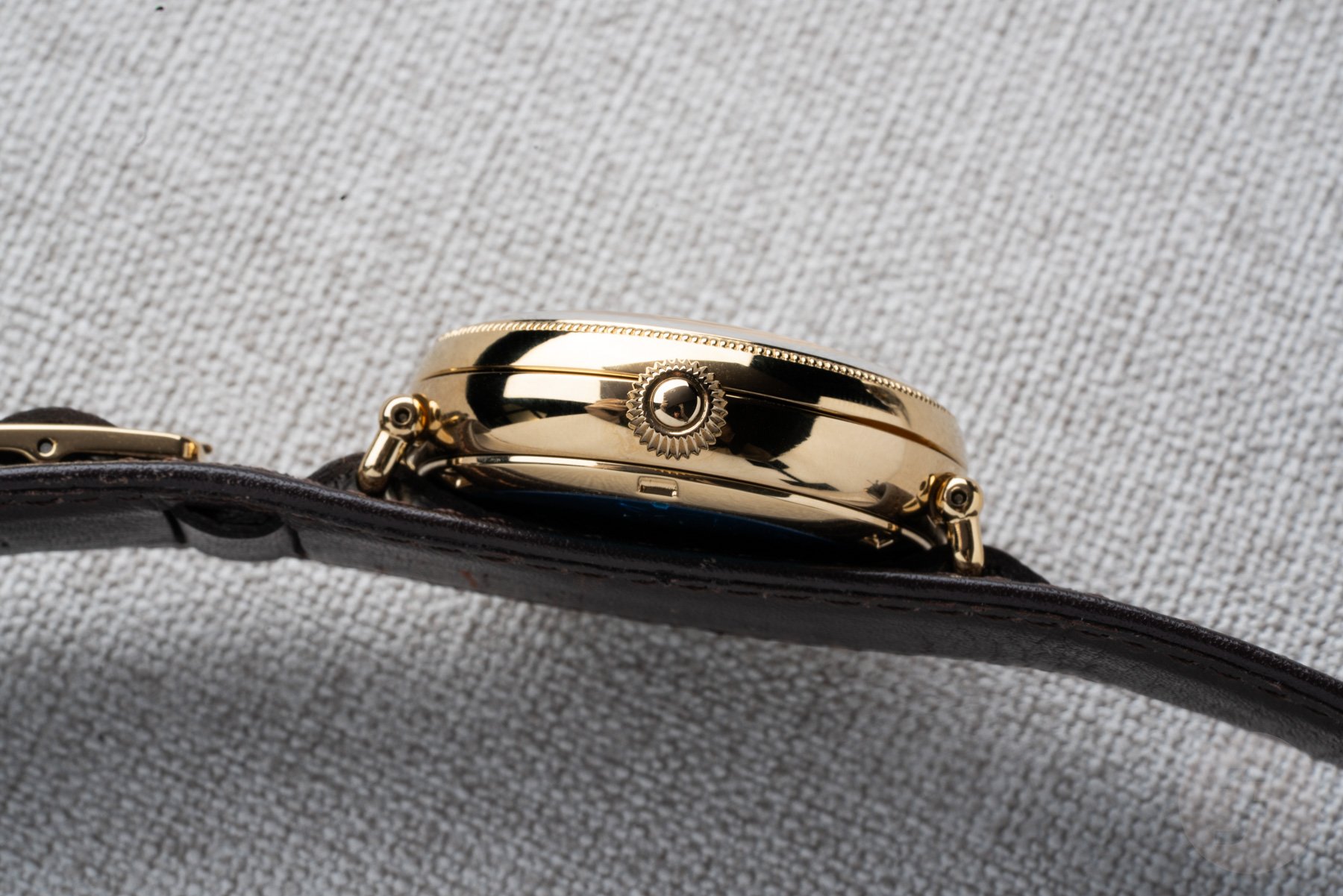 The third and last of the four models we spent time with is part of the Seiko Presage Classic Series. To be more precise, it’s part of the “Craftsmanship” line because of its beautiful white enamel dial. But I’m getting ahead of myself. This SPB538 is based on a version of the famous Seiko Timekeeper pocket watch. The circular gold-plated stainless steel case features a wonderfully detailed bezel and an onion-shaped crown. As you can see, the watch also has articulating lugs, a nod to its pocket-watch roots.