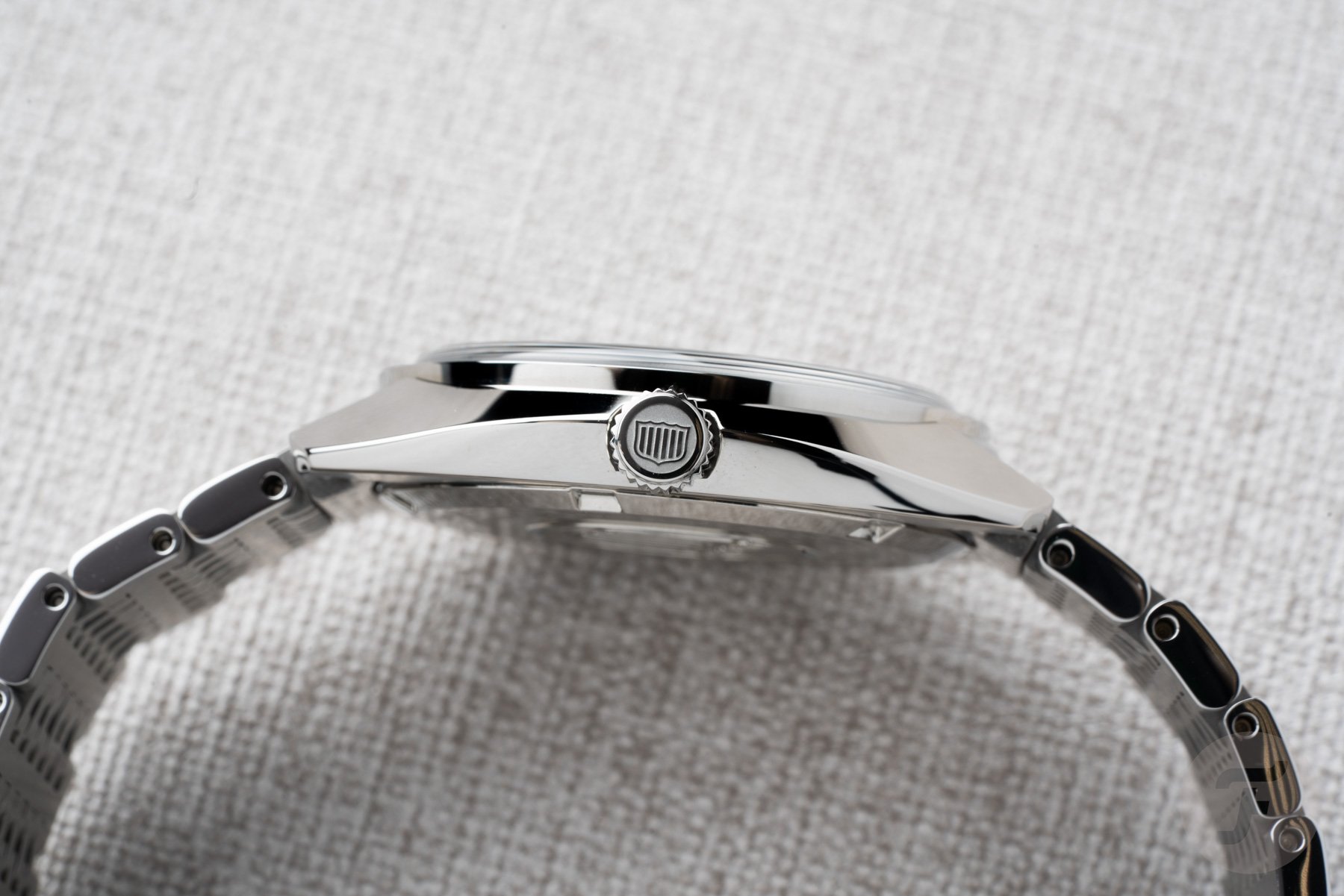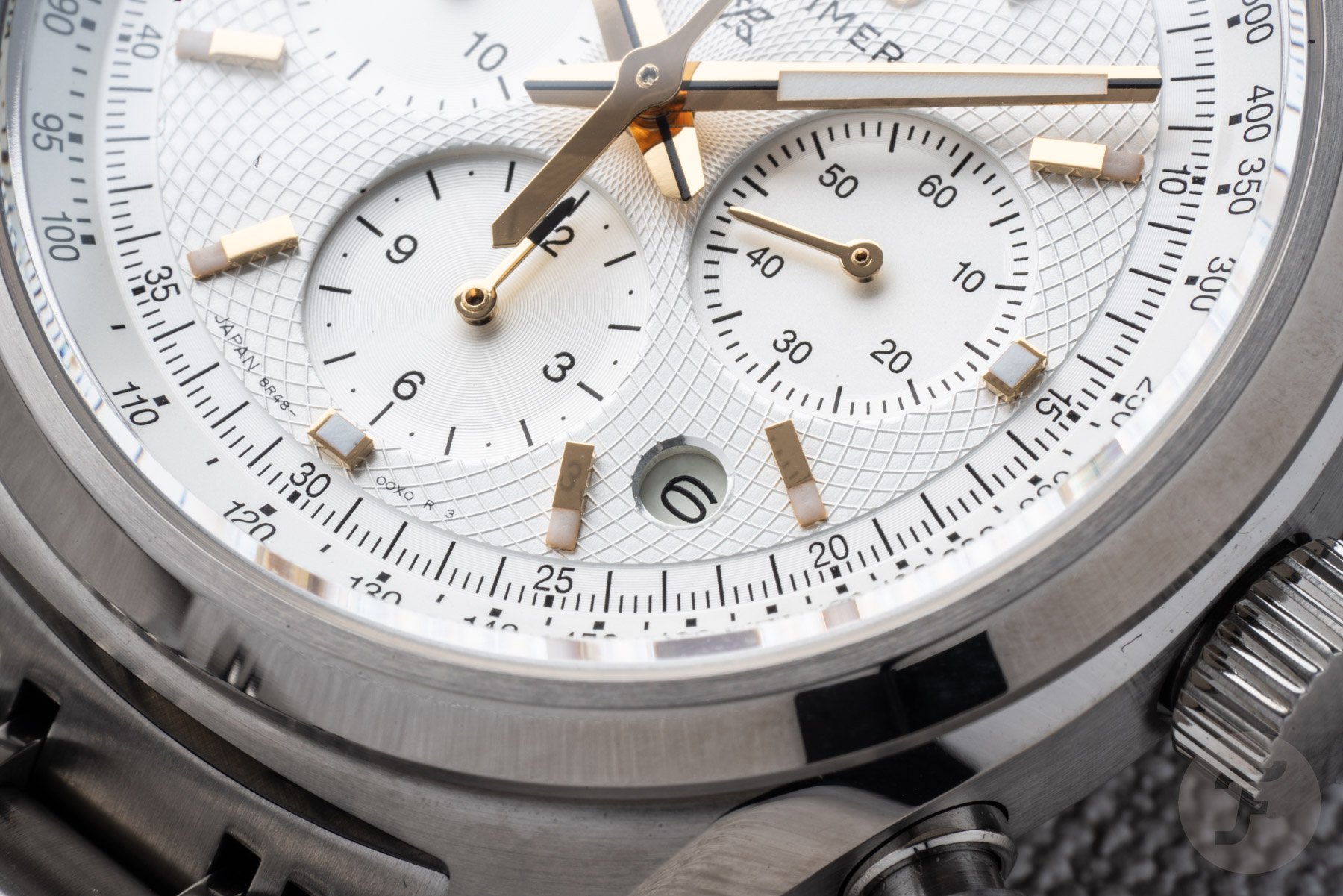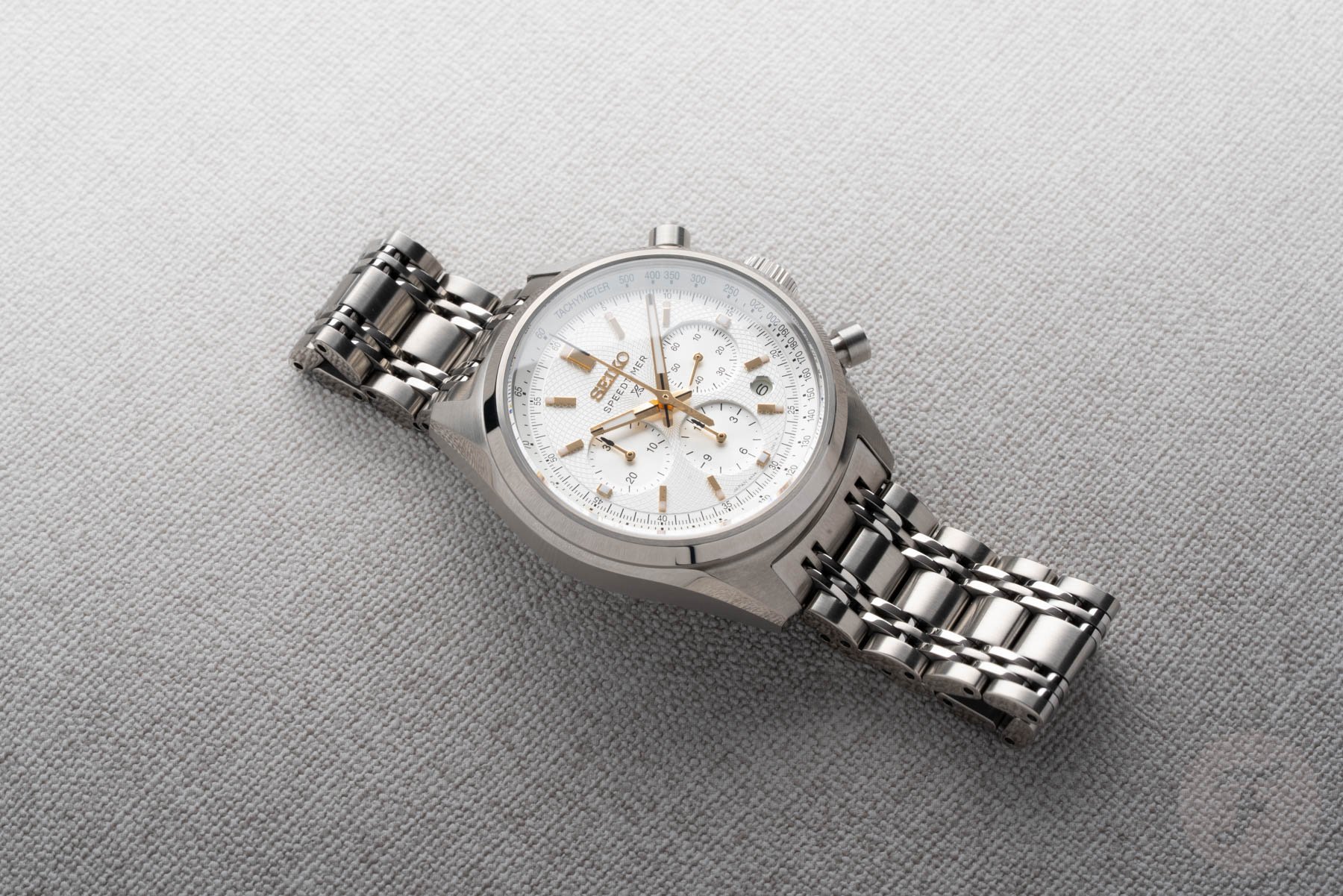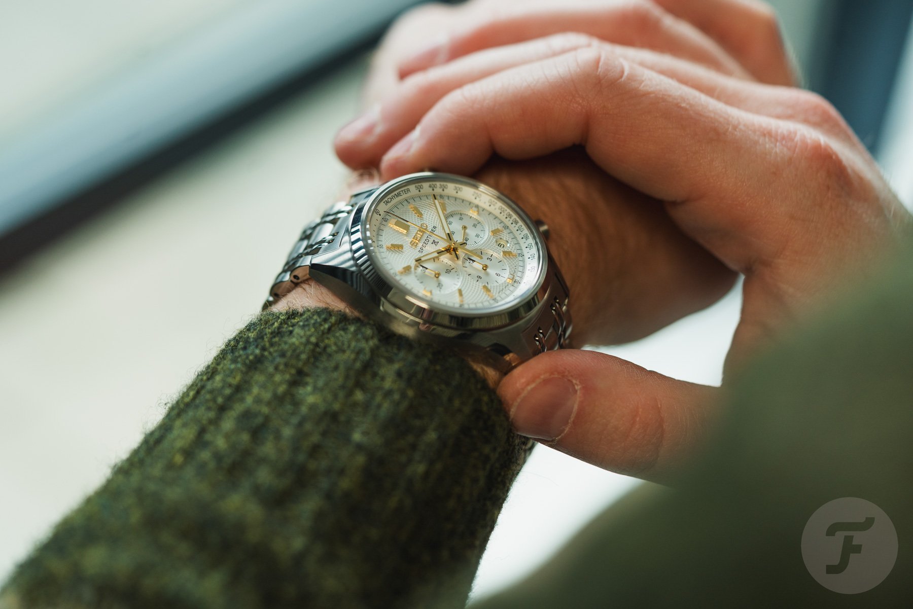 The newest variation features a crisp white dial with an intricate radial pattern and gold accents. Once again, the pattern was inspired by a pattern engraved on Hattori’s early timepieces, making this reference stand out compared to other Speedtimers. Somehow, this watch also reminded me of the IWC GST Chronograph ref. IW3707-13 from the early 2000s that also uses that color scheme. It’s not one we see often, but it looks handsome.